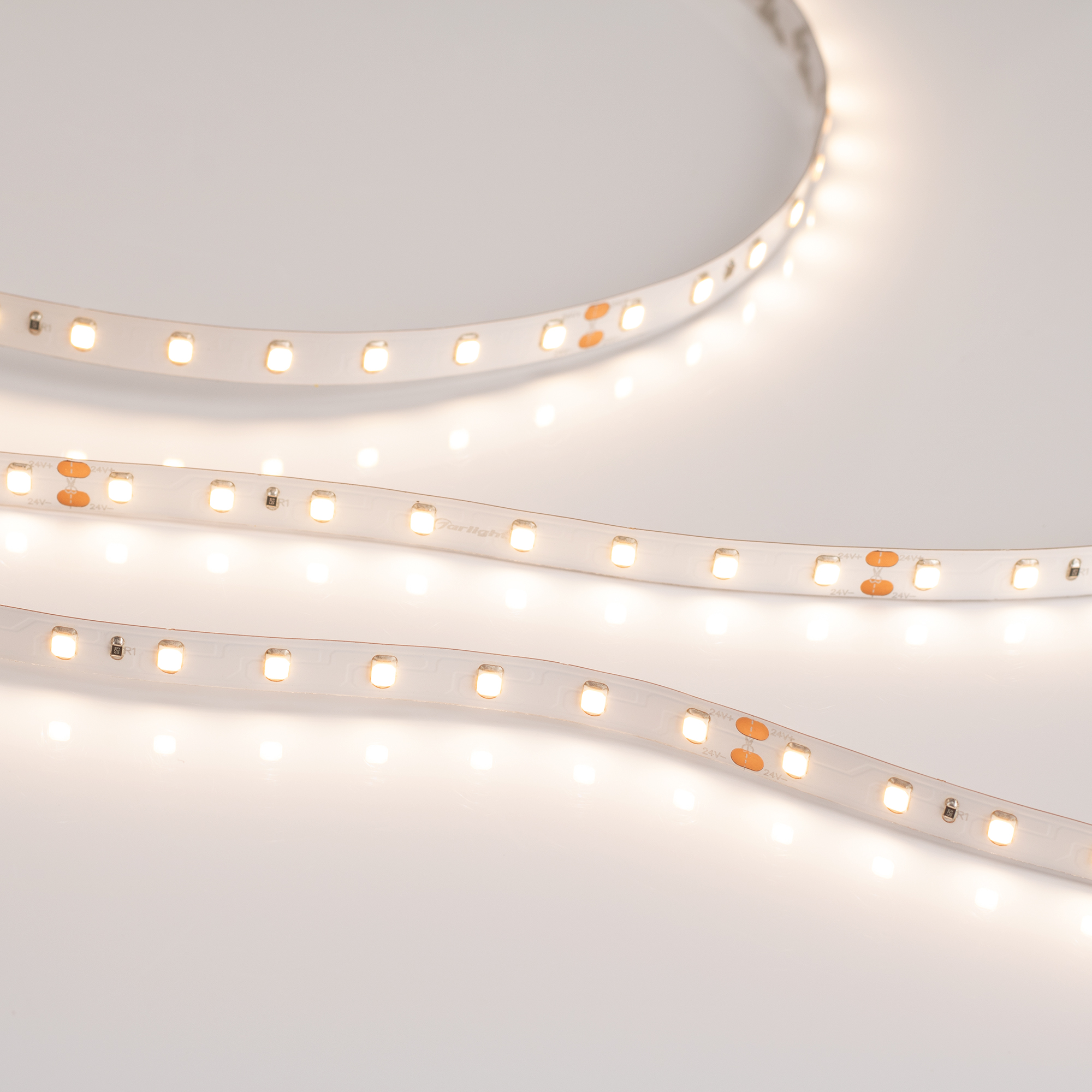 Открытая светодиодная лента шириной 8 мм и мощностью 6 Вт/м с индексом цветопередачи CRI>85. Светодиоды SMD 2835 (80 шт/м) теплого белого цвета свечения (2900–3100 К). Напряжение питания 24 В. Минимальный отрезок 100 мм (8 светодиодов). Высокая световая эффективность 150 лм/Вт позволяет создать качественное освещение в любых помещениях. Лента применяется для декоративной подсветки интерьеров, потолочных ниш, рабочих зон кухни, мебели, а также подходит для подсветки рекламных конструкций и витрин.