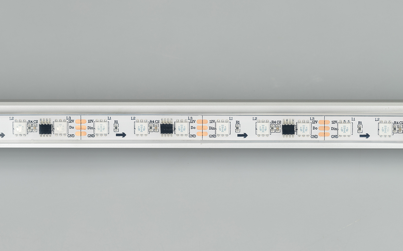 Герметичная многоцветная лента «бегущий огонь» с драйвером 16703 для применения как в помещениях, так и на улице. Рекомендуется подключение с двух сторон ленты. RGB-светодиоды SMD 5060 (60 шт/м) в литой силиконовой трубке с высокой степенью пылевлагозащиты (IP67). Возможно подключение внешнего контроллера. Ширина платы 12 мм, мощность 14.4 Вт/м, напряжение питания 12 В. Создание рекламных вывесок, оформление витрин, помещений для дискотек, ресторанов, театрализованных шоу, изготовление медиафасадов. Минимальный отрезок 50 мм.