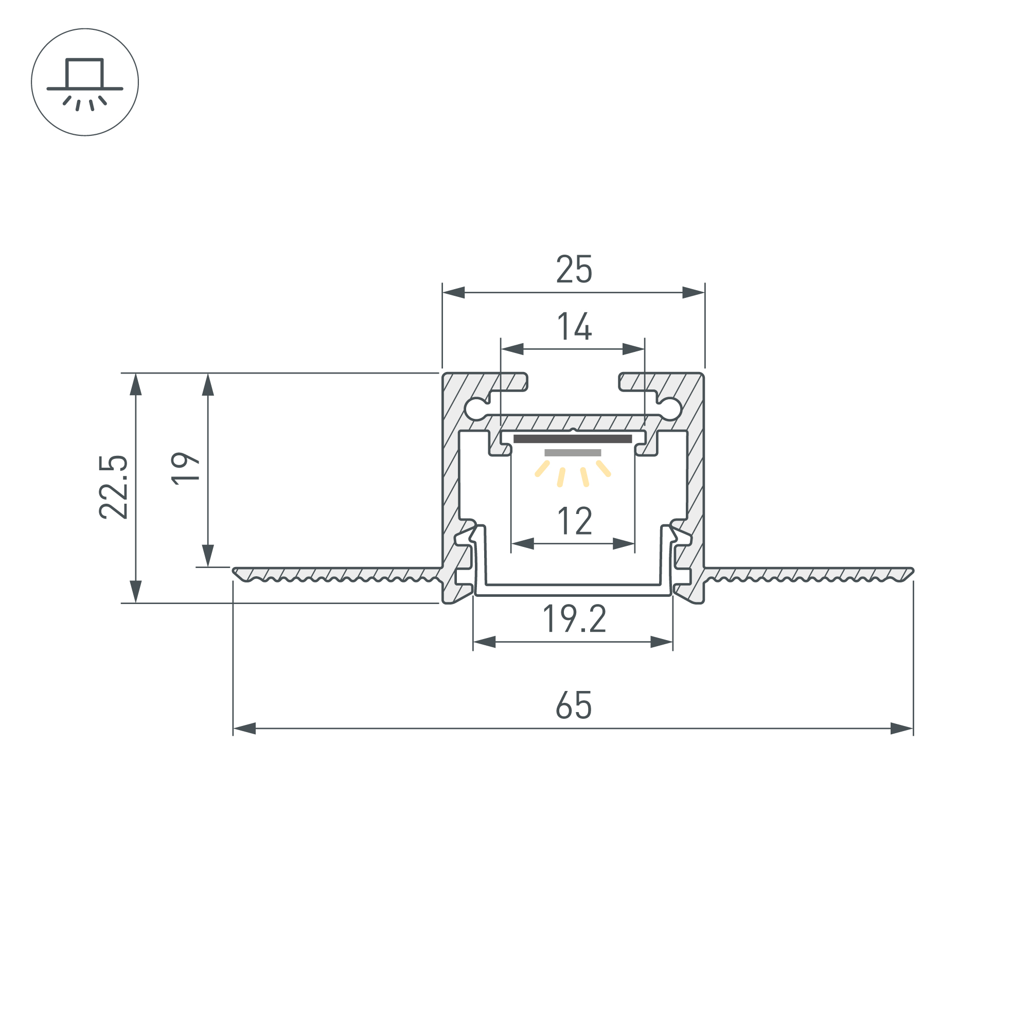 Алюминиевый профиль для светодиодных лент и линеек. Скрытая установка (под строительную отделку). Цвет - черный RAL9005 (порошковая окраска). Габаритные размеры (L×W×H): 2500x65x22 мм. Ширина площадки для ленты 12 мм. Экраны, заглушки и другие аксессуары приобретаются отдельно. Цена за 1 метр.