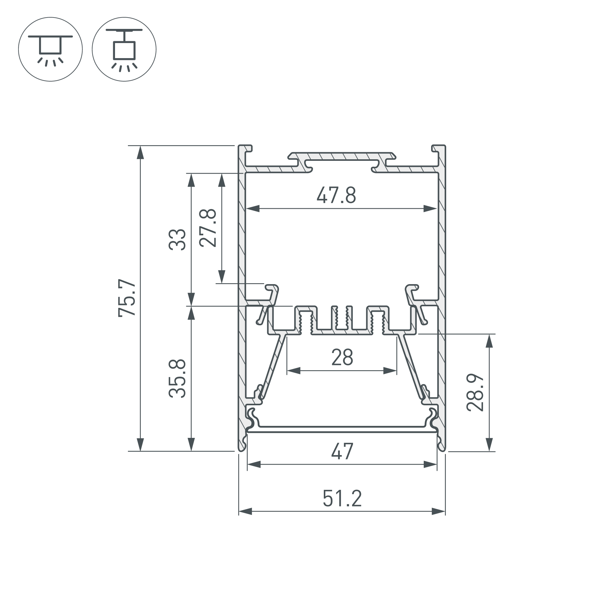 Отсек для блока питания (47,8х27,8 мм) и съемная площадка для светодиодной ленты значительно облегчают сервисное обслуживание осветительного оборудования. Габаритные размеры профиля составляют 2000 мм в длину, 51,2 мм в ширину и 75,7 мм в высоту. Площадки для установки светодиодных лент позволяют использовать ленты шириной до 28 мм и мощностью до 46 Вт/м. Это обеспечивает гибкость в выборе светодиодных лент и создает потрясающие световые решения.
