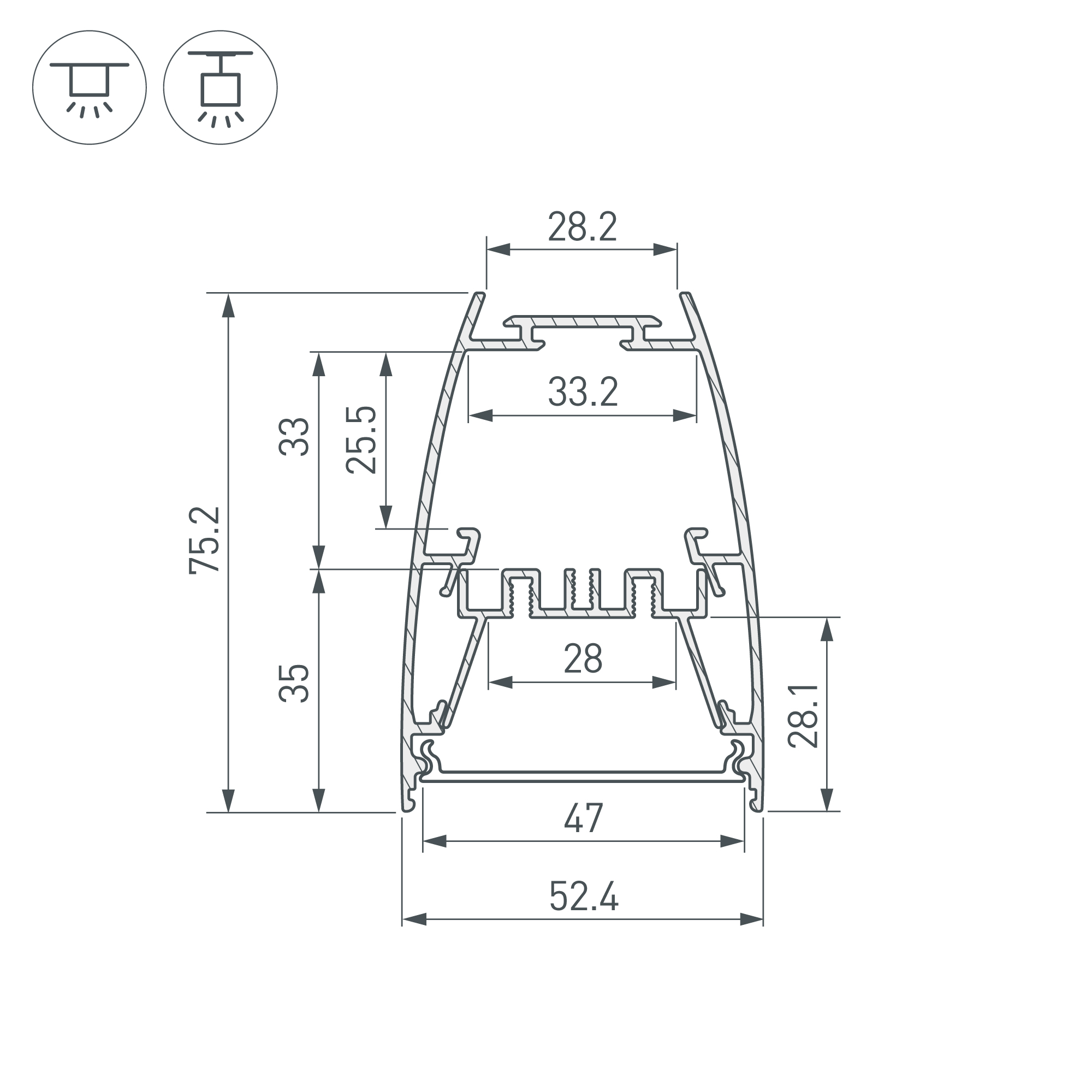Подвесной/накладной профиль черного цвета из алюминия для основного освещения и контурной подсветки. Возможность установки антибликовой решетки Honeycomb поверх экрана позволяет получить более комфортное для глаз освещение. Отсек для блока питания (33,2х25,5 мм) и съемная площадка для светодиодной ленты значительно облегчают сервисное обслуживание осветительного оборудования. Габаритные размеры профиля составляют 2000 мм в длину, 75,2 мм в ширину и 52,4 мм в высоту. Площадки для установки светодиодных лент позволяют использовать ленты шириной до 28 мм и мощностью до 46 Вт/м. Это обеспечивает гибкость в выборе светодиодных лент и создает потрясающие световые решения. Экраны, заглушки и другие аксессуары не включены в комплект и приобретаются отдельно. Цена указана за 1 метр профиля. Отличное решение для создания современных световых проектов.