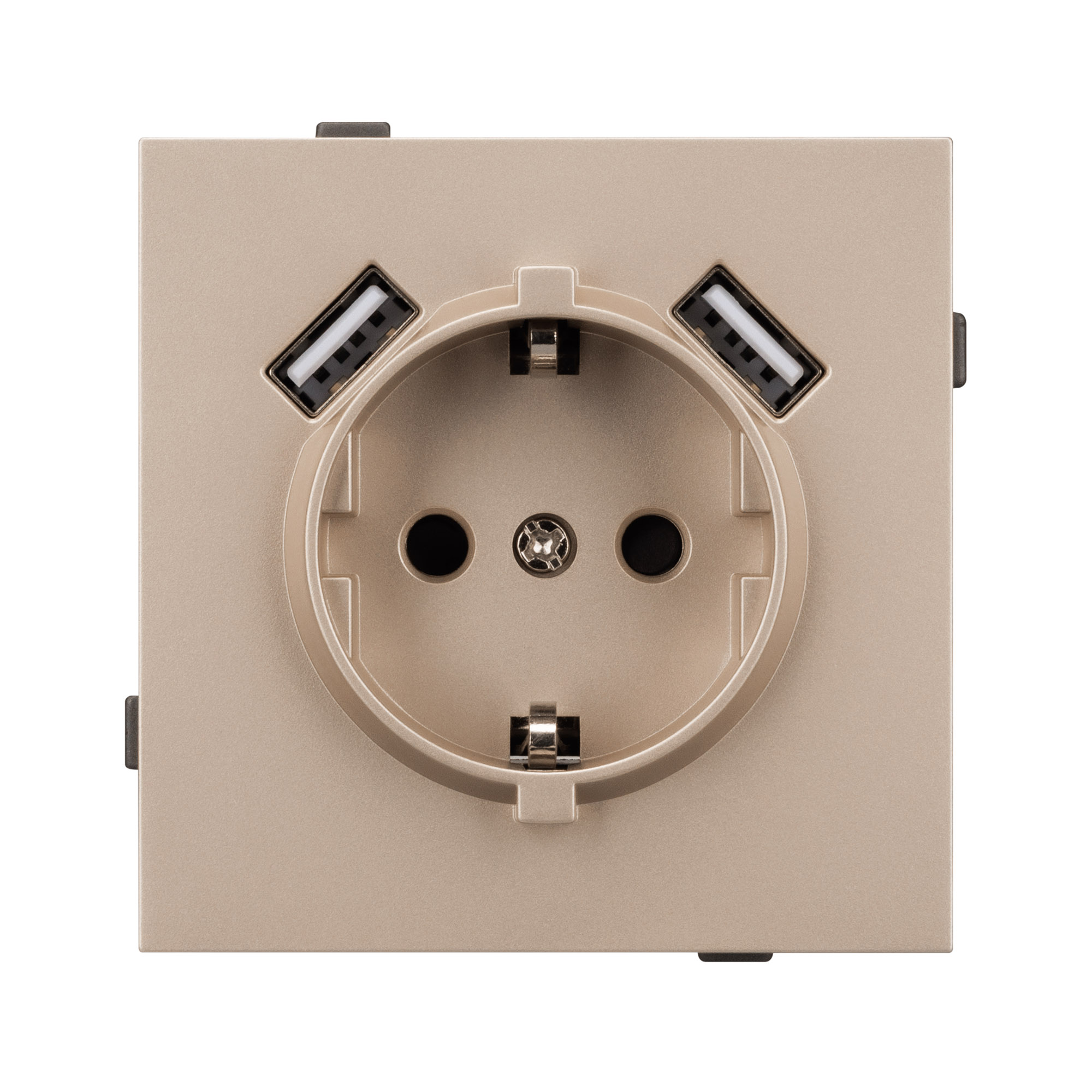 Механизм розетки с USB зарядкой, совместимый с рамками серии TENDO, создает утонченный минималистичный вид. Наличие двух USB Type A портов позволяет существенно сократить количество используемых розеточных постов под евровилку, сохраняя единую стилистику интерьера всего современного дизайн-проекта. Видимая часть механизма выполнена из высококачественного пластика золотого цвета и имеет матовое покрытие, что придает изделию приятные тактильные ощущения и стильный внешний вид. Розетка оснащена заземляющими контактами и защитными шторками, обеспечивая надежное и безопасное подключение электроприборов. Контактная часть присоединяется при помощи винтовых зажимов, позволяя надежно подсоединить механизм выключателя к питающим элементам. А усиленные распорные лапки двойного захвата надежно фиксируют механизм в установочном подрозетнике круглого сечения диаметром от 60мм. Суппорт окрашен в черный матовый цвет под основу механизма и выполнен из металла толщиной 1,5мм, что обеспечивает безопасность и уверенность в установке. На каждой стороне суппорта размещены фиксирующие элементы, позволяющие комбинировать механизмы в системы до 5шт как горизонтально, так и вертикально.