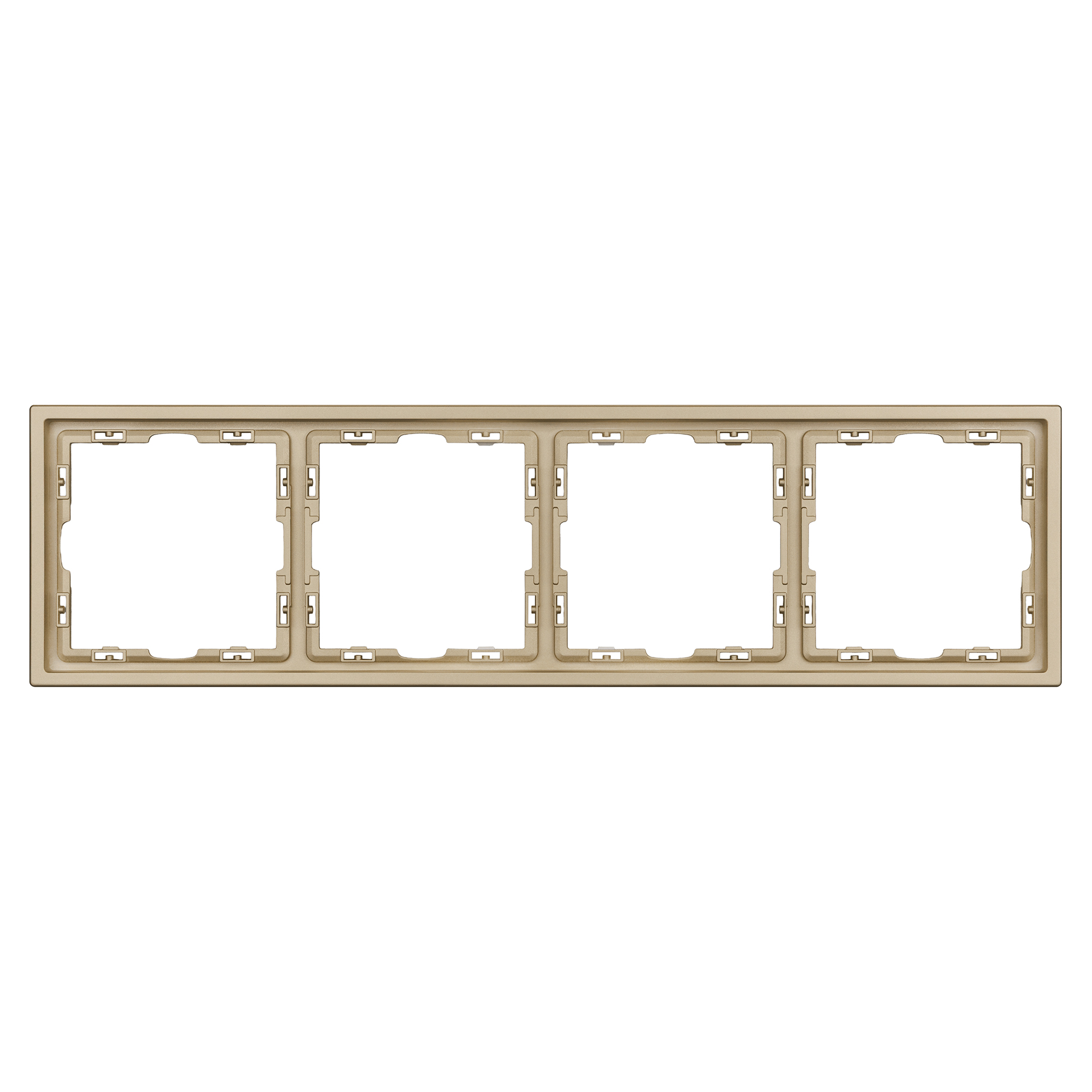 Рамка пластиковая на 4 поста, под встраиваемый механизм. Цвет - золотой, с Soft-Touch покрытием. Среднего уровня герметичности IP20. Ориентация монтажа горизонтальная. Габаритные размеры: длина 294 мм, ширина 81 мм, высота 8.55 мм. Гарантийный срок 12 мес.
