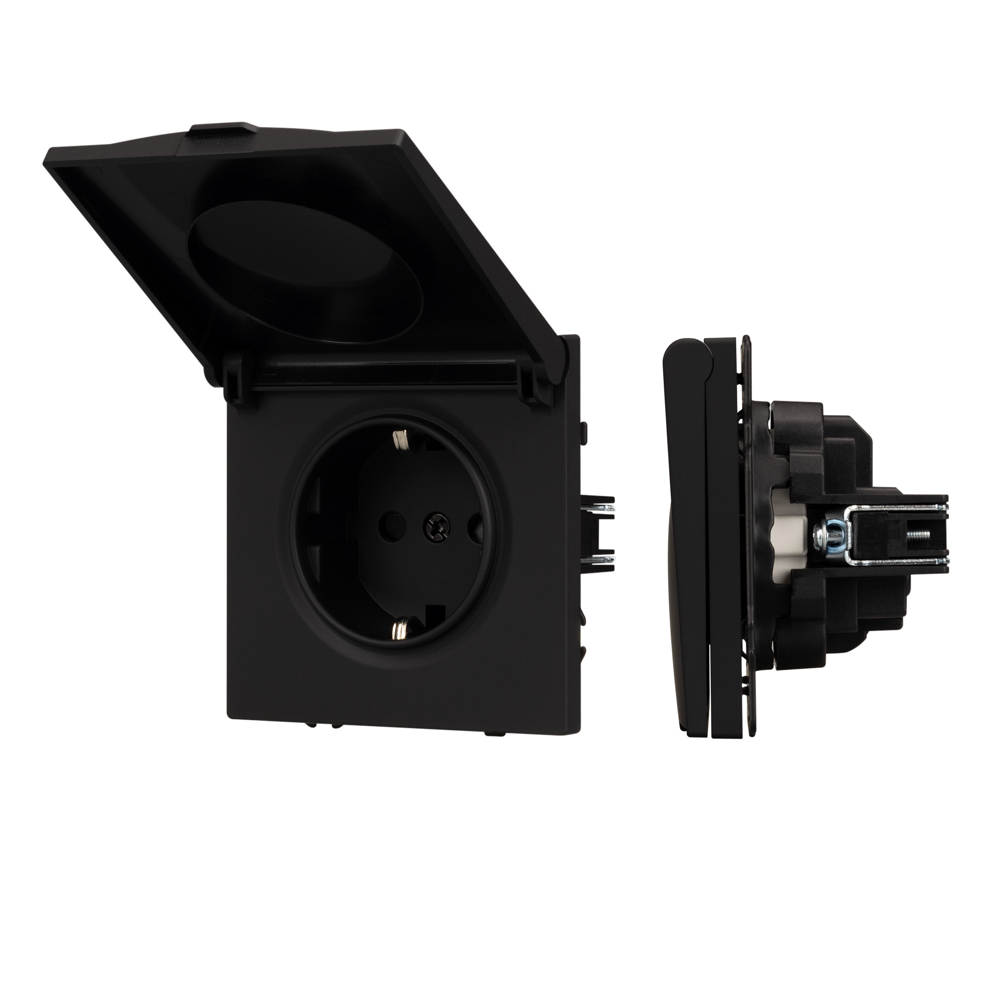Механизм розетки влагозащищенный совместим с рамками серии NOBE, создает утонченный минималистичный вид. Наличие влагозащитной крышки позволяет размещать готовое устройство в зонах с повышенной влажностью, при этом соблюдая единую стилистику интерьера всего современного дизайн-проекта. Видимая часть механизма выполнена из высококачественного пластика черного цвета и имеет Soft-Touch покрытие, что придает изделию приятные тактильные ощущения и стильный внешний вид.