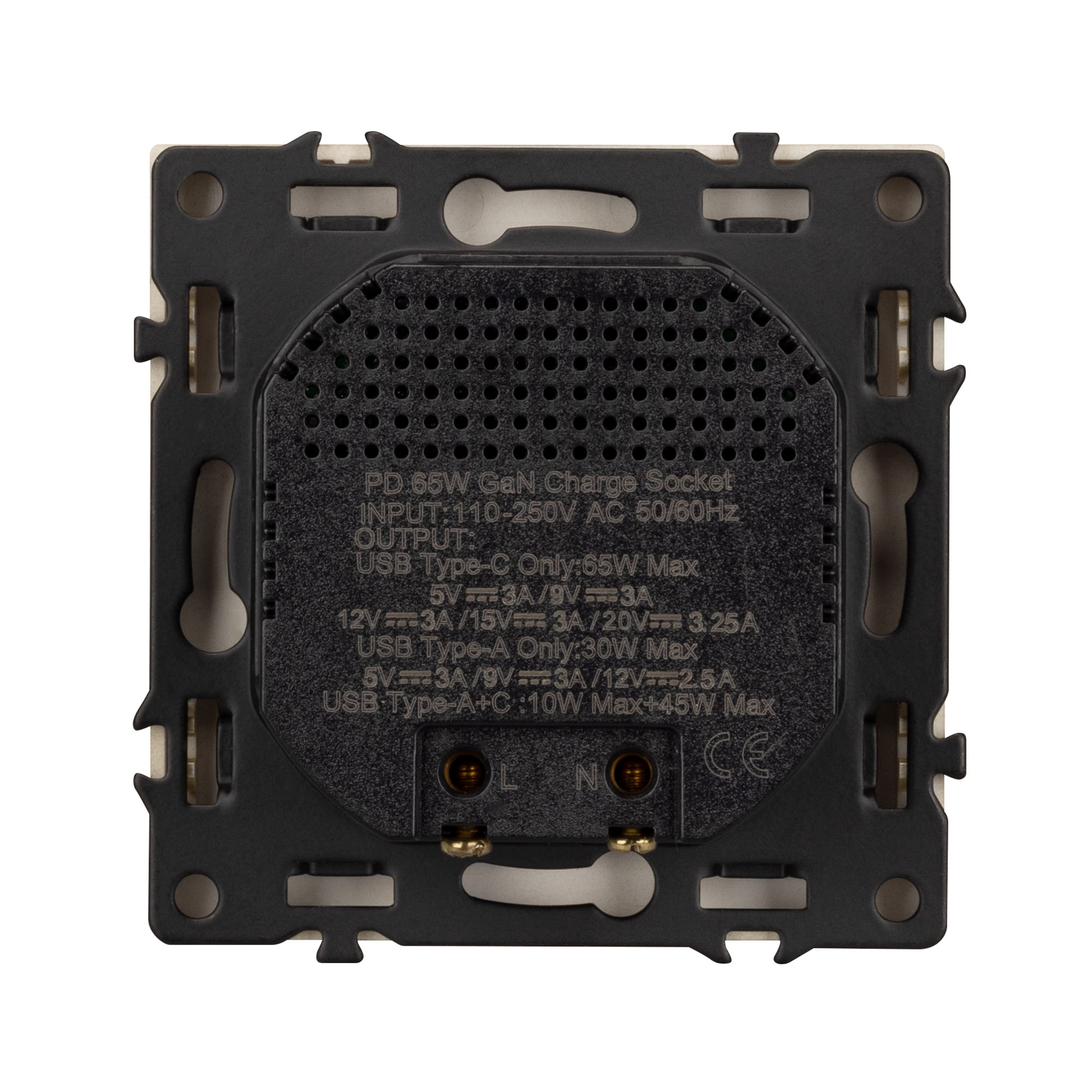 Механизм розетки с быстрой USB зарядкой, совместимый с рамками серии NOBE, создает утонченный минималистичный вид. Наличие USB Type A и Type C портов позволяет существенно сократить количество используемых розеточных постов под евровилку, сохраняя единую стилистику интерьера всего современного дизайн-проекта. Оба разъема поддерживают протокол быстрой зарядки Quick Charge QC 3.0, помимо этого для разъема Type C доступен протокол Power Delivery*.