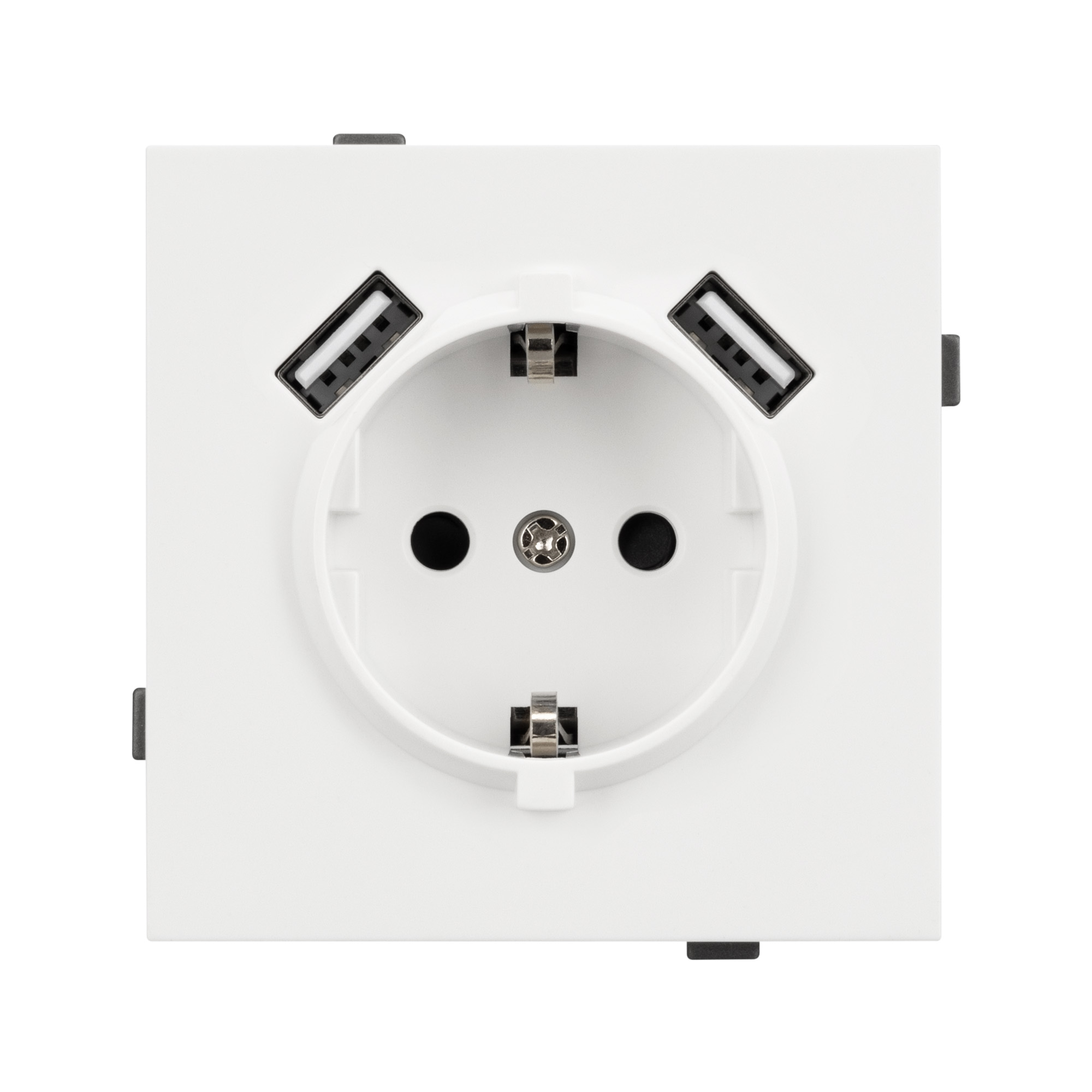 Механизм розетки с USB зарядкой, совместимый с рамками серии NOBE, создает утонченный минималистичный вид. Наличие двух USB Type A портов позволяет существенно сократить количество используемых розеточных постов под евровилку, сохраняя единую стилистику интерьера всего современного дизайн-проекта. Видимая часть механизма выполнена из высококачественного пластика матового белого цвета и имеет Soft-Touch покрытие, что придает изделию приятные тактильные ощущения и стильный внешний вид.