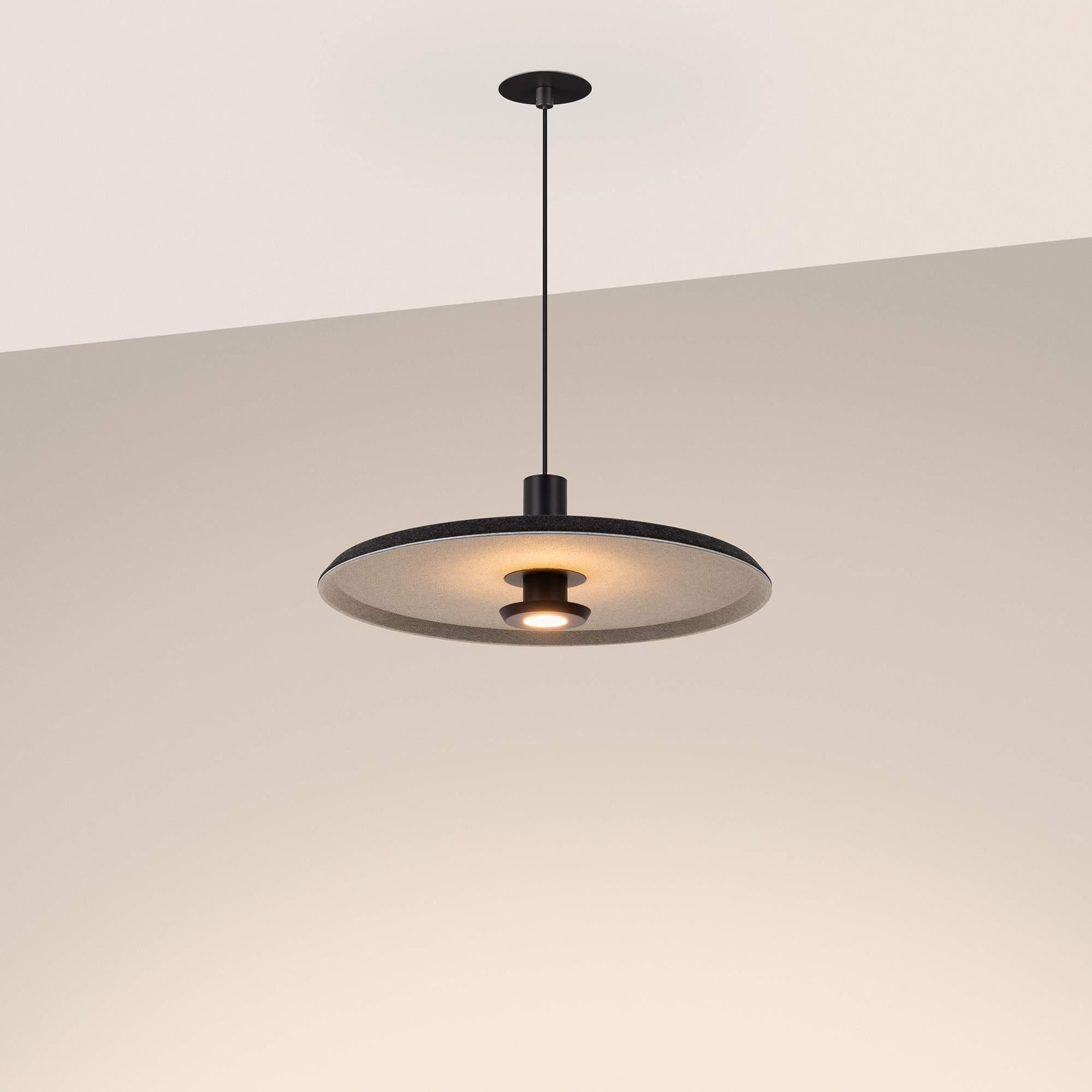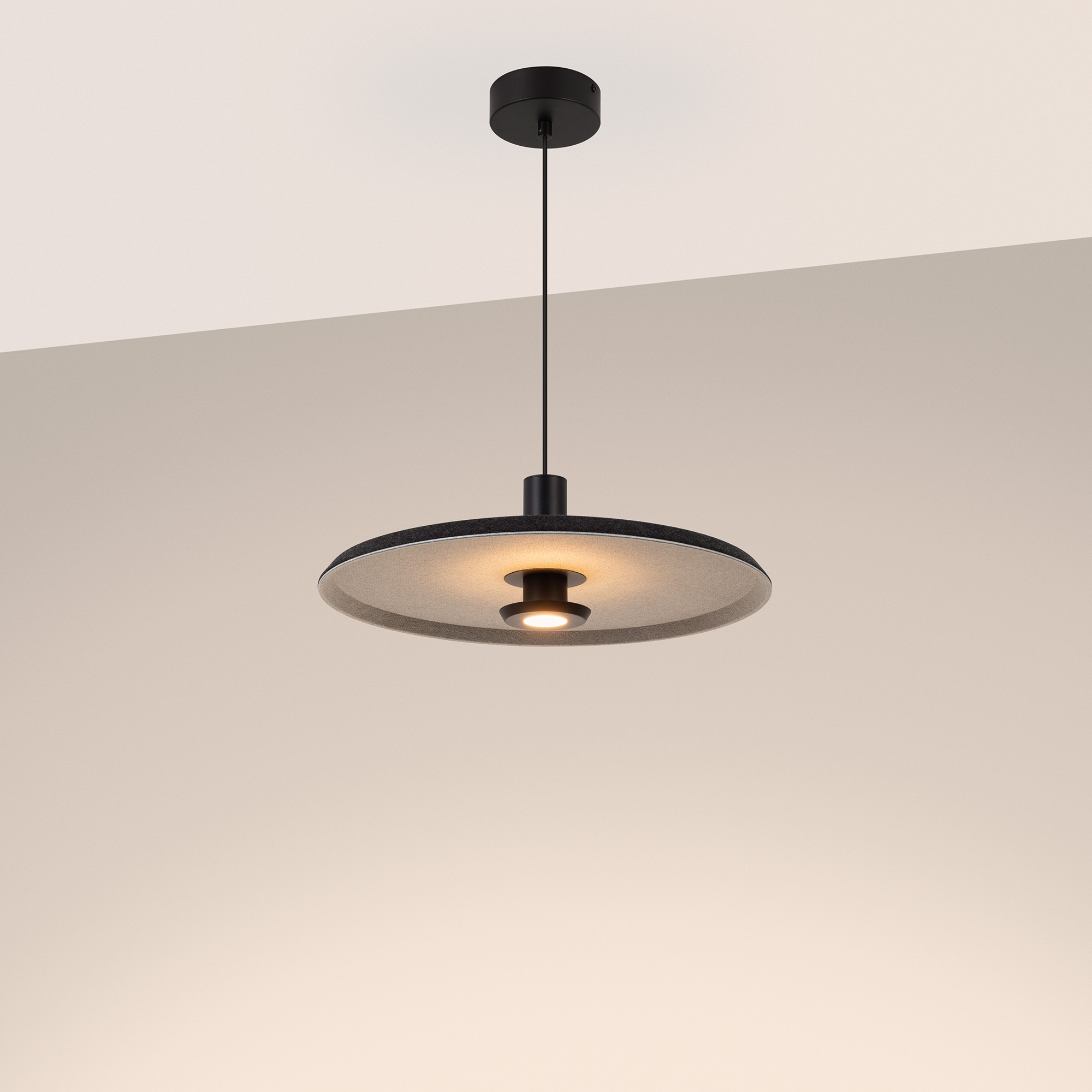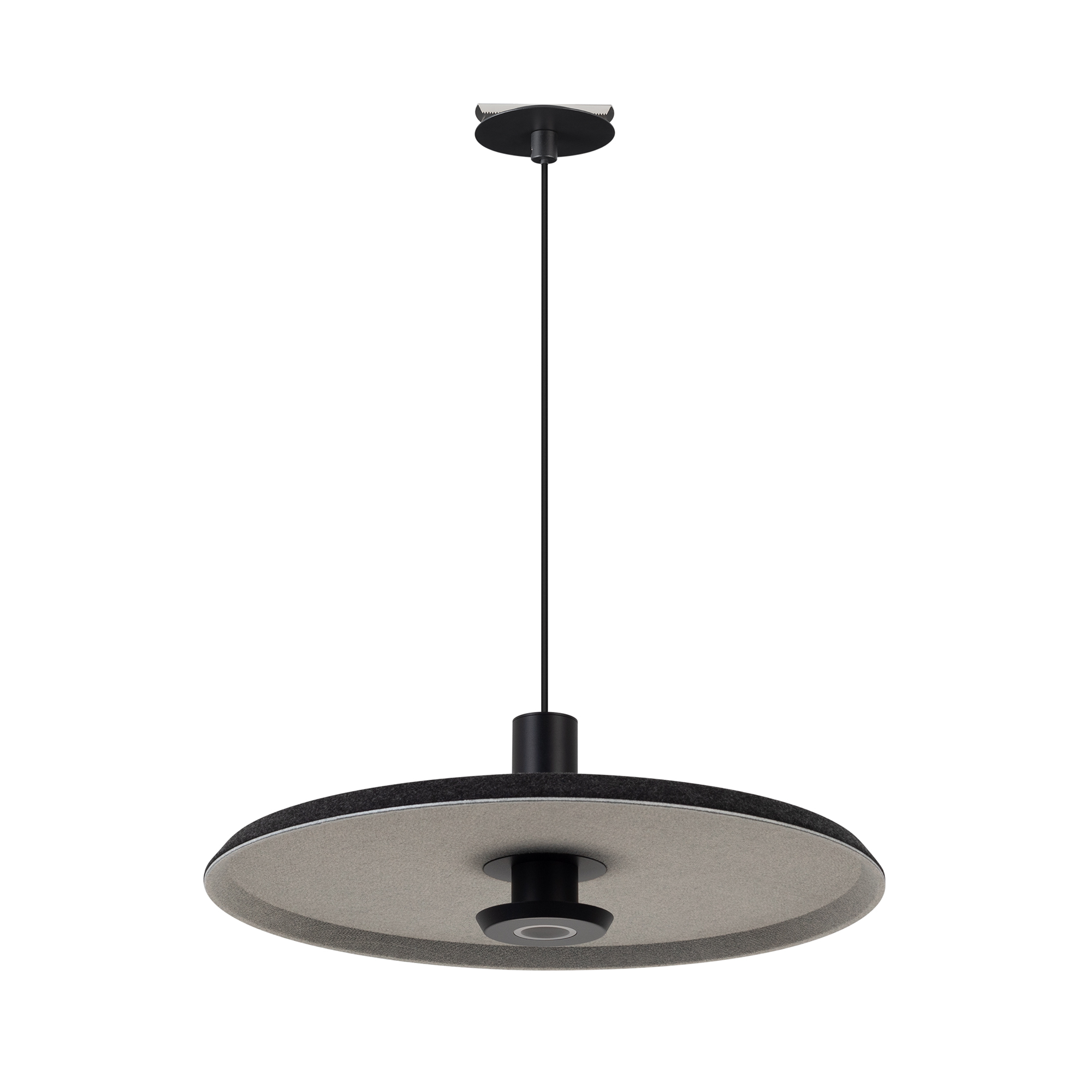 Подвесной светильник. Мощность 12 Вт, св. поток 768 лм, 64 лм/Вт, теплый 3000 K, CRI>94, угол 36°, напряжение питания 230 В. Темно-серый фигурный плафон из переработанного фетра со светло-серой внутренней поверхностью, линза-рассеиватель из PMMA, степень защиты IP20. Размер: диаметр 450 мм, высота 145 мм. Монтаж подвесной, длина подвеса 2000 мм, регулируемая. В комплекте 2 вида чаш. Габариты чаши (встраиваемая) Ø80 х 23 мм, врезное отверстие Ø60 мм. Габариты чаши (накладная) Ø120 x 35 мм. Драйвер 59В, 300 мА, пульсация <1%. Управление по TRIAC.