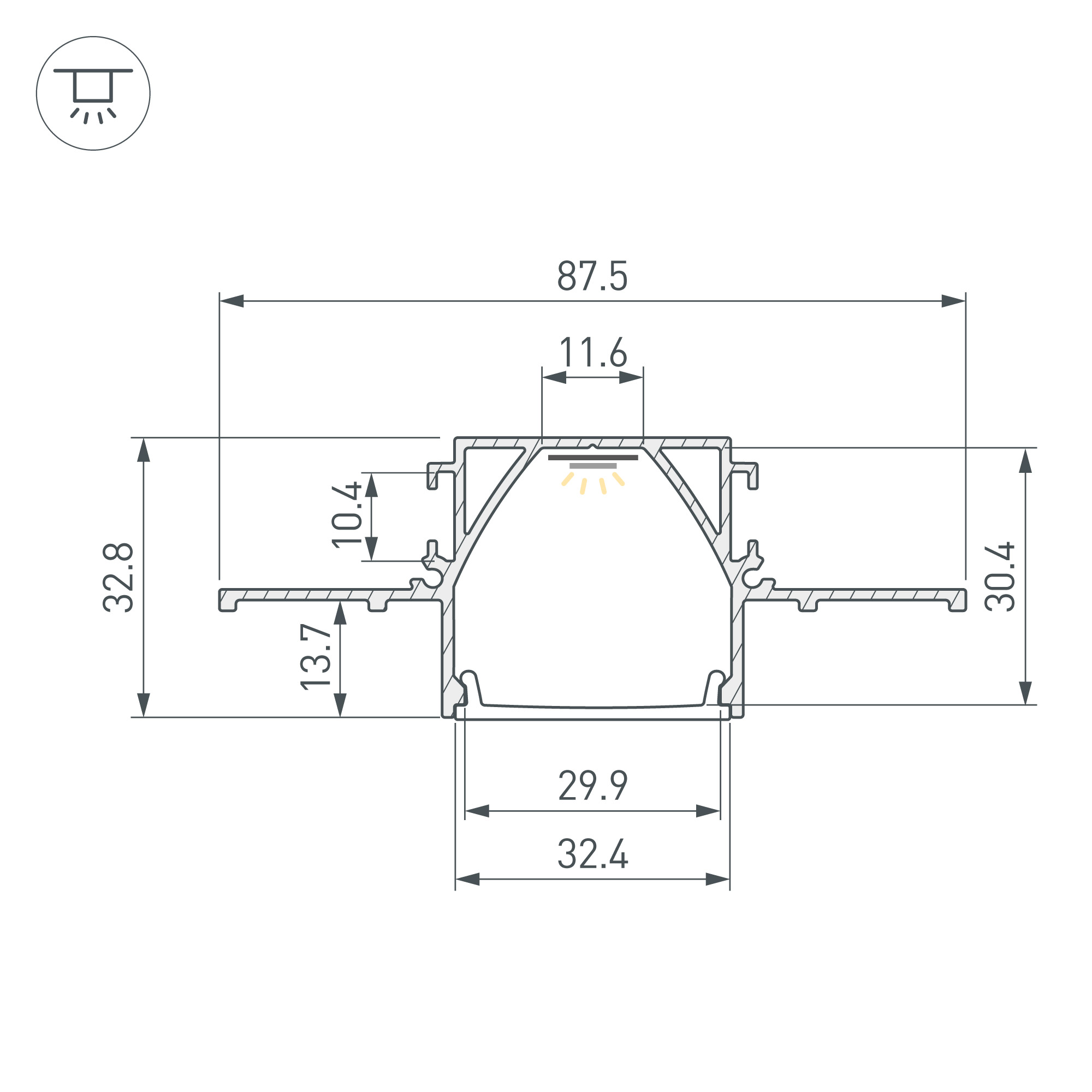 Встраиваемый профиль из анодированного алюминия со скрытым фланцем для установки в гипсокартон толщиной 12,5 мм для основной и контурной подсветки помещений. Габаритные размеры профиля составляют 2000 мм в длину, 87,5 мм в ширину и 32,8 мм в высоту. Площадка для установки светодиодных лент позволяет использовать ленту шириной до 11 мм и мощностью до 35,7 Вт/м. Это обеспечивает гибкость в выборе светодиодных лент и создает потрясающие световые решения. Экраны, заглушки и другие аксессуары не включены в комплект и приобретаются отдельно. Цена указана за 1 метр профиля. Отличное решение для создания современных световых проектов.