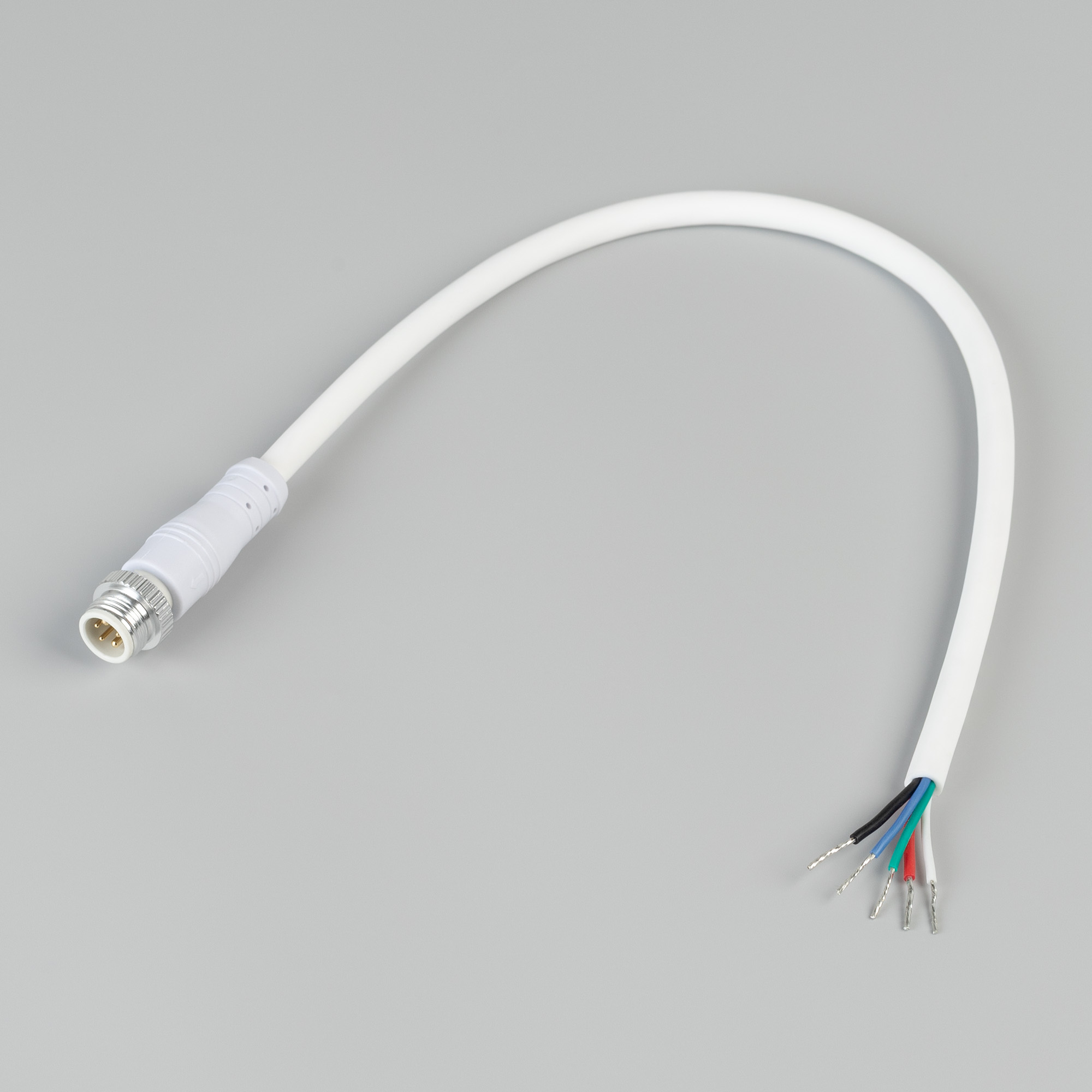 Герметичный Male (папа) коннектор питания на проводе для RGBW герметичной ленты серии WAVE-DOUBLE 1615, обеспечивает простое и надежное подключение с уровнем пылевлагозащиты IP67. Провод имеет белую оболочку, коннектор сделан из белого пластика, и имеет габариты 250x15x15 мм.