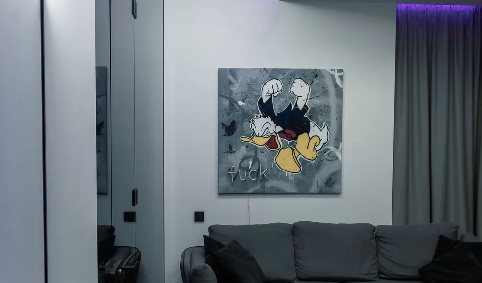 Основу интерьера частной квартиры составляет насыщенная серая цветовая гамма — от глубокого графитового оттенка до «лофтового» металлика. Пол теплого древесного цвета вносит в холодную монохромность ощущение уюта, а яркие цветные детали оживляют пространство. Картина с мультяшным героем, оригинальные текстуры и цветная подсветка создают в пространстве жизнерадостную и неформальную атмосферу.
