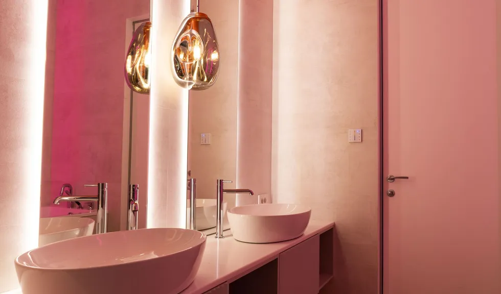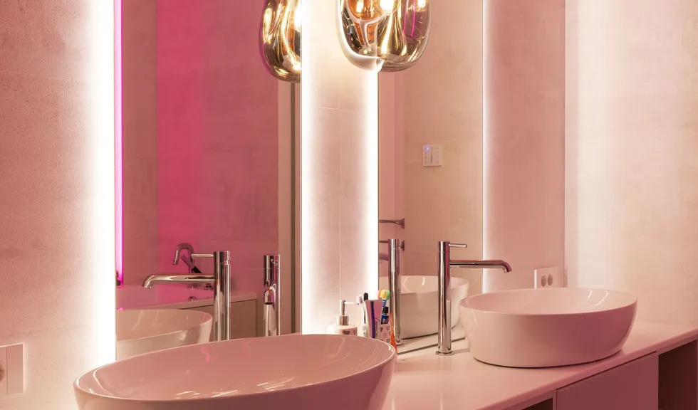 RGB-подсветка особенно актуальна в детских пространствах. В одной детской комнате лента RGB подсвечивает подиум со спальным местом, образуя красивый парящий эффект. В свою очередь магнитные трековые светильники обеспечивают локальное освещение. В другой детской — яркая RGB-подсветка интегрирована прямо в полки шкафа белого цвета, что настраивает на веселый и жизнерадостный лад. Особое место — детская ванная. Несмотря на то, что общий цвет — «взрослый» кремовый, оранжевая и голубая вставки на потолке, а также ярко-розовая подсветка в углу возле ванной делают ее привлекательной для детей.