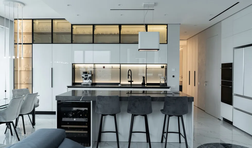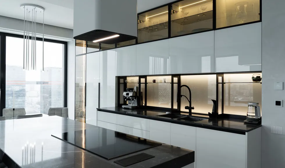 Кухонный гарнитур с прозрачными шкафчиками подсвечен изнутри светодиодной лентой теплого белого цвета, что придает интерьеру легкость.