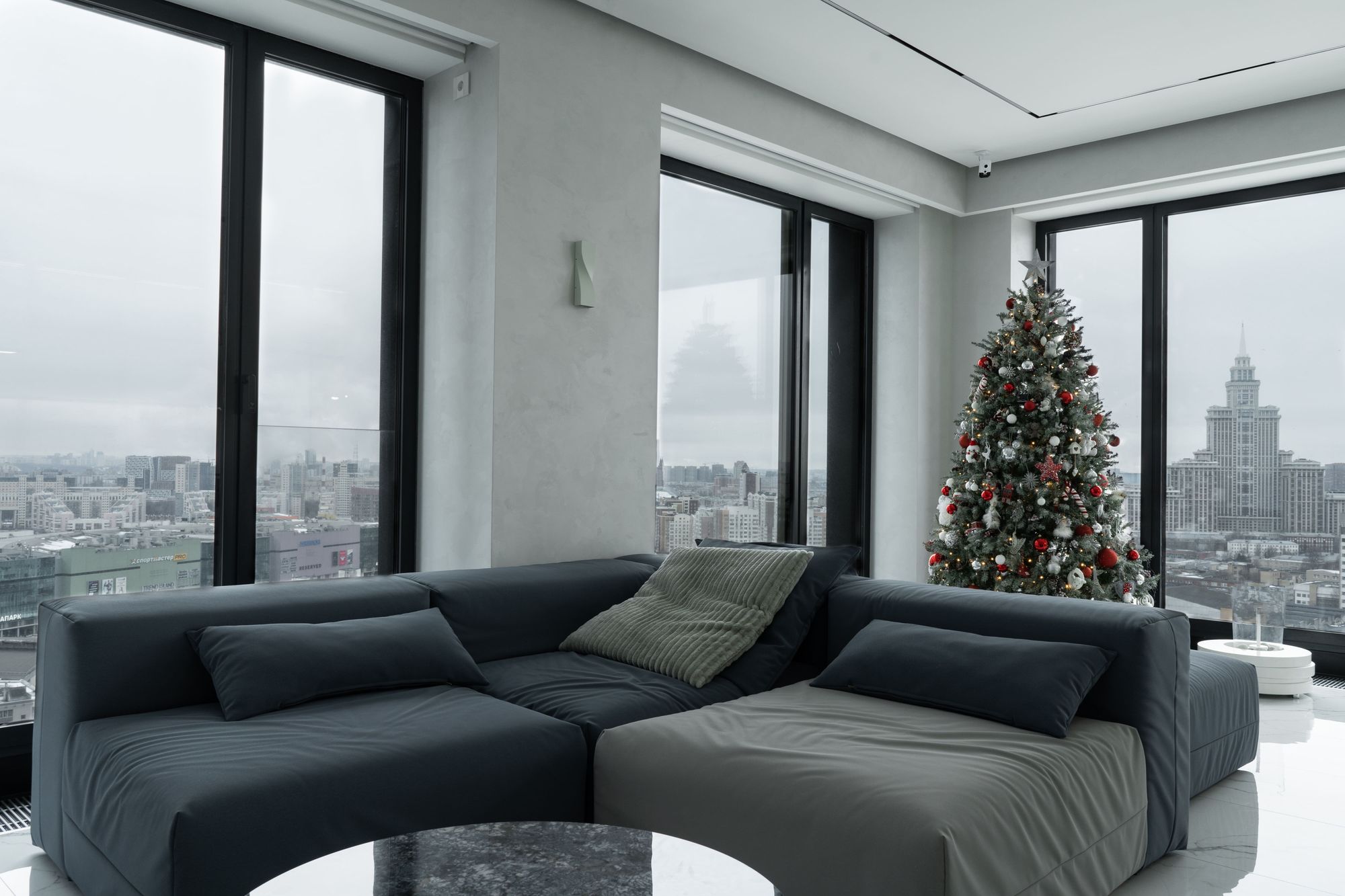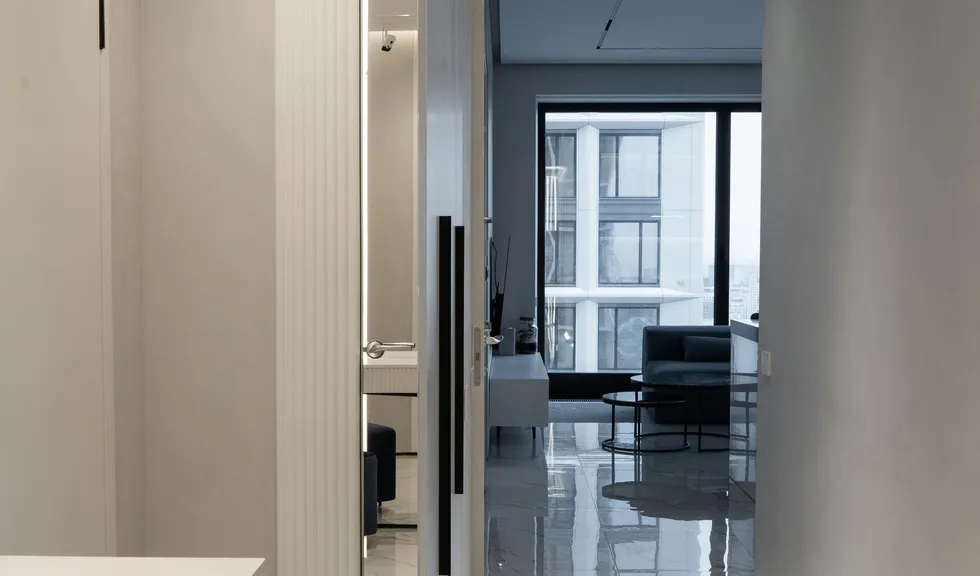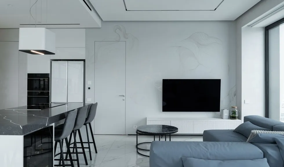 Квартира в многоквартирном элитном доме выполнена в монохромной цветовой гамме и является уютным и эргономичным пространством для семьи из пяти человек. Интерьер выдержан в благородных серых, белых и бежевых оттенках, которые не утомляют даже в больших пространствах.