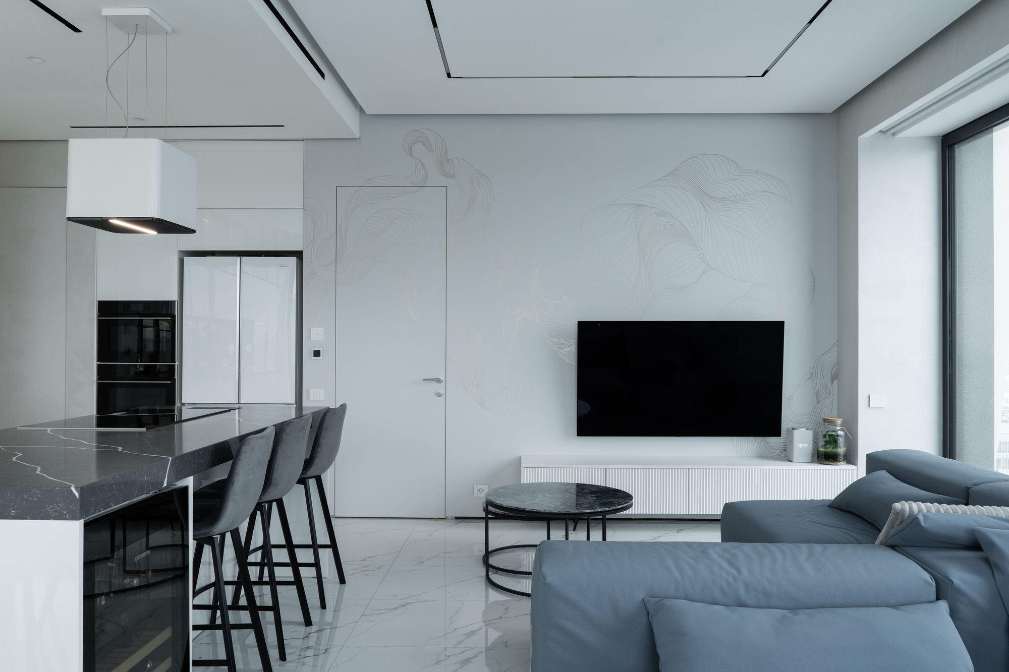 В каждой комнате — квадратное панорамное окно, пропускающее внутрь много естественного света, что является одновременно и вызовом, и возможностью для светодизайна. В кухне-гостиной встроенная линия трека повторяет геометрию окон, а установленные в шинопровод светильники полностью интегрированы в потолок и практически незаметны.