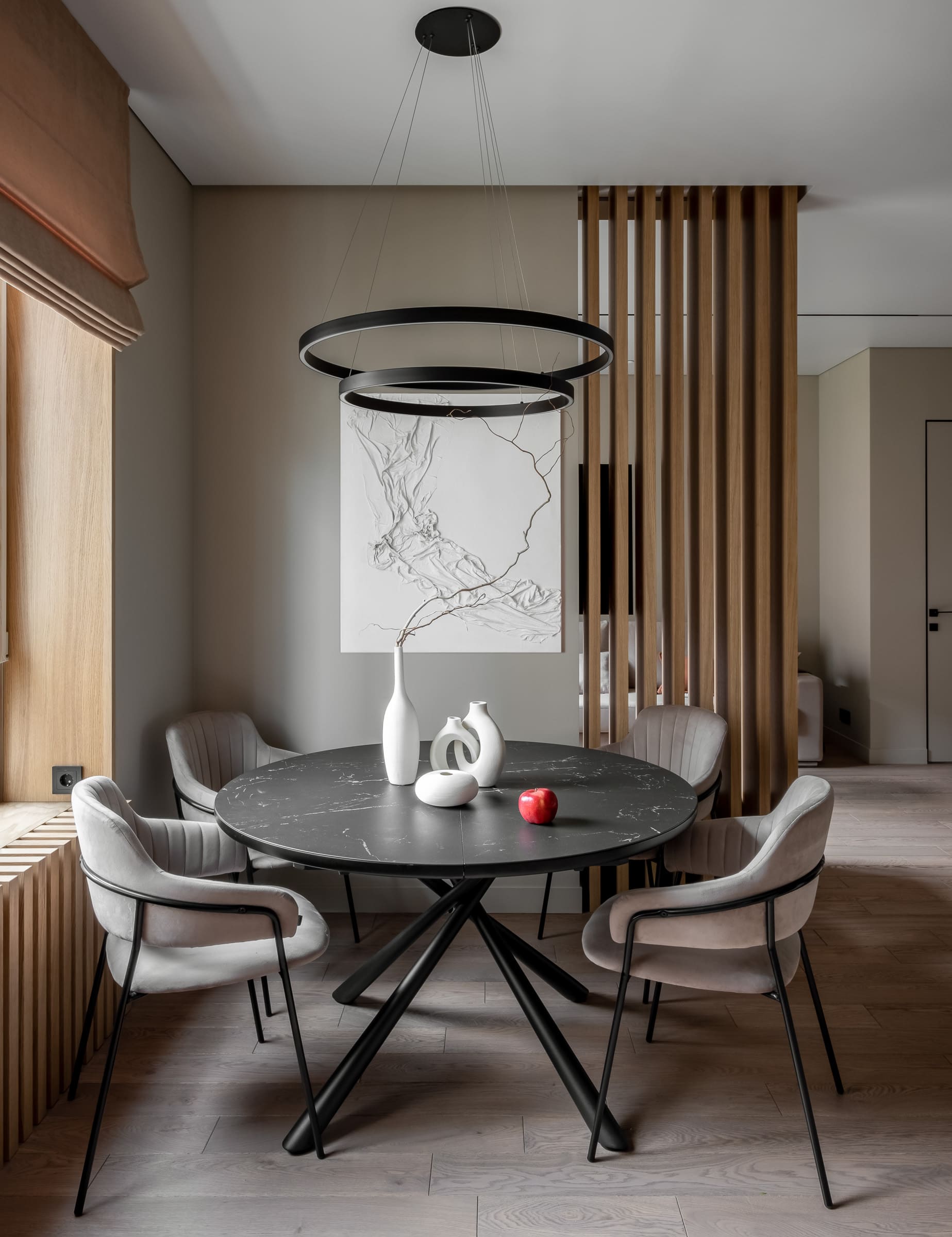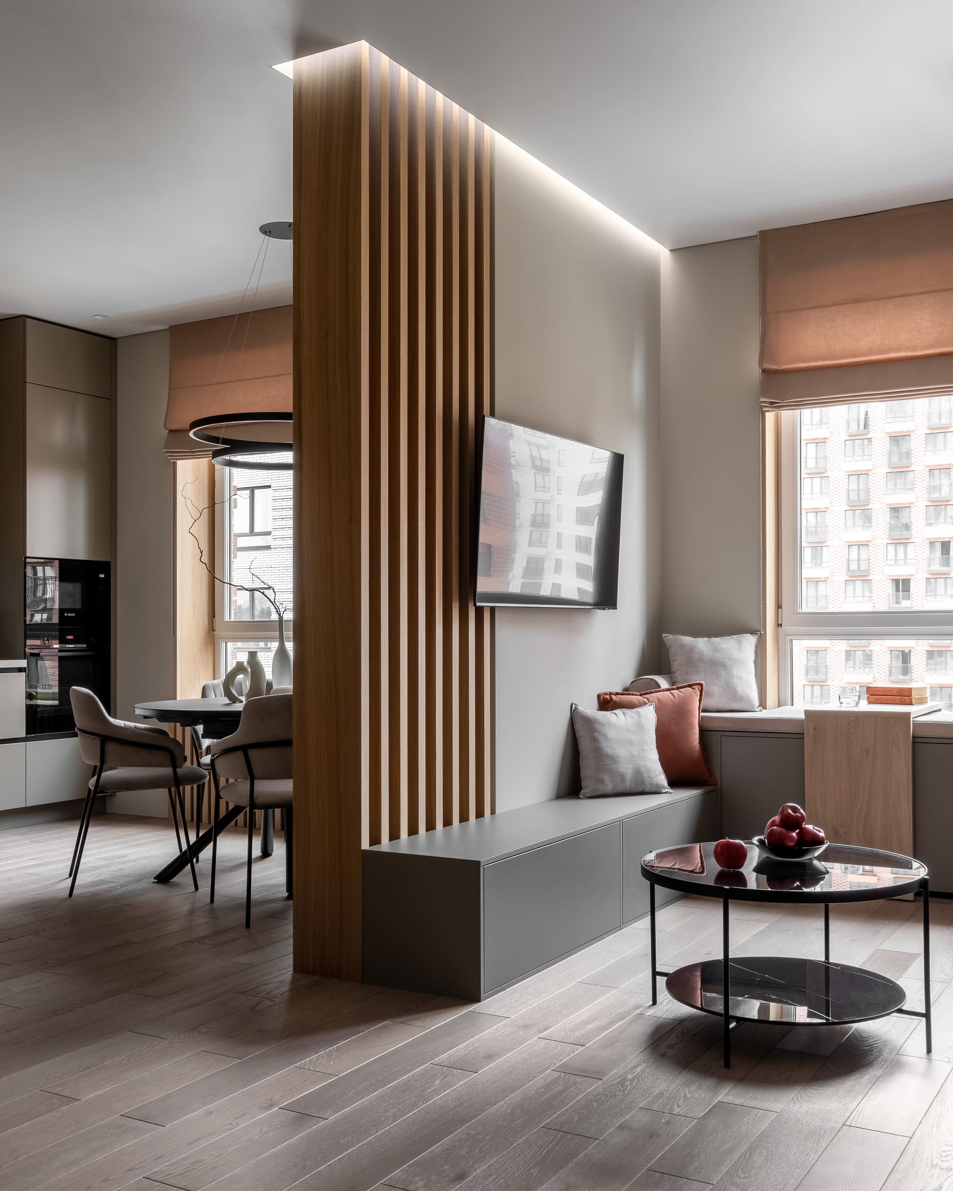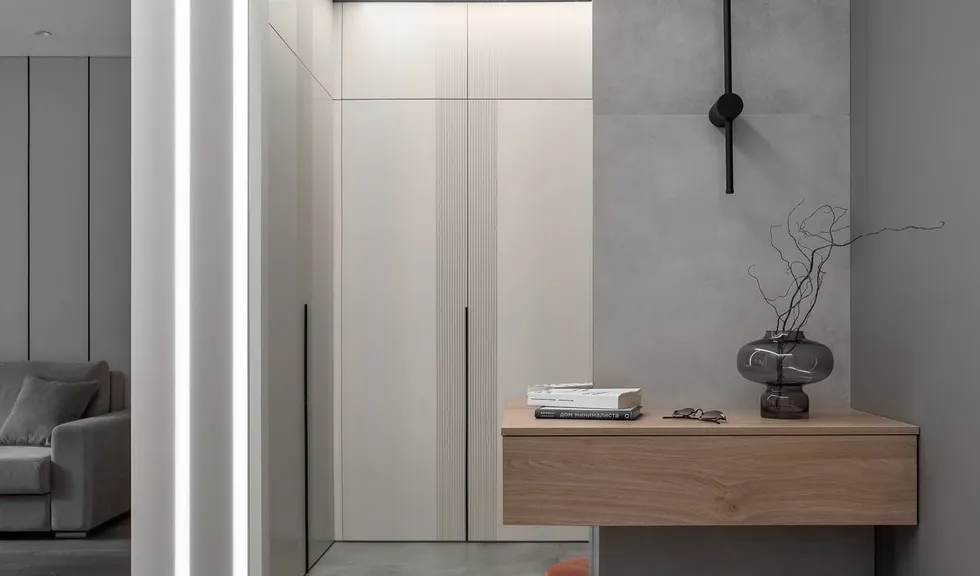 Интерьер квартиры на Большой Филевской улице выполнен в теплых серых, бежевых и кремовых оттенках, которые каждый раз раскрываются по-новому благодаря различным источникам освещения.