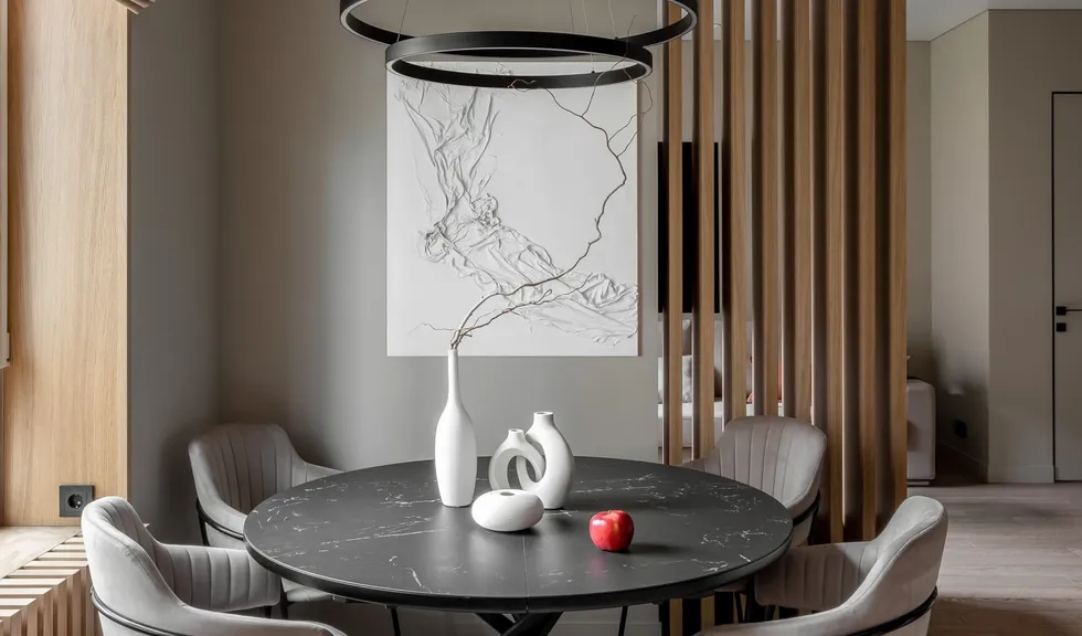 В качестве дополнительного освещения в зоне гостиной применяется магнитная трековая система MAG ORIENT. Светильник FLAT образует линии света, которые лаконично вписываются в интерьер. При необходимости светильники можно передвигать в шинопроводе, тем самым меняя световые акценты в пространстве. В свою очередь, закарнизная подсветка, образующая эффект парящего потолка, визуально придает комнате легкости.