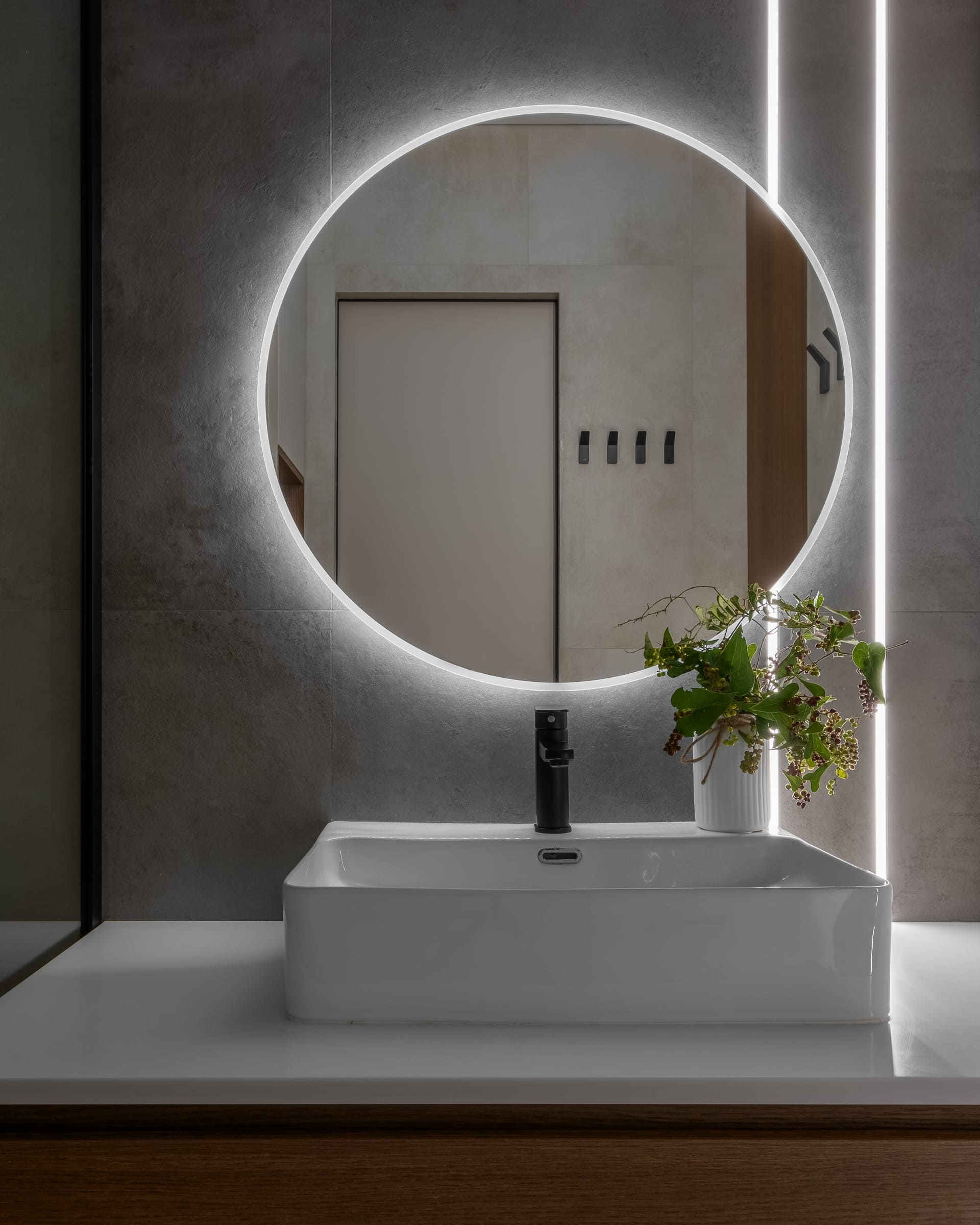 Парные линии света в прихожей сходят с потолка на стены, что создает достаточную освещенность в самой темной зоне квартиры. Для данной цели были применены светодиодные ленты серии RT с двумя рядами светодиодов. Главная особенность этих лент — очень высокий индекс цветопередачи (CRI>98), благодаря чему создается эффект естественного света.