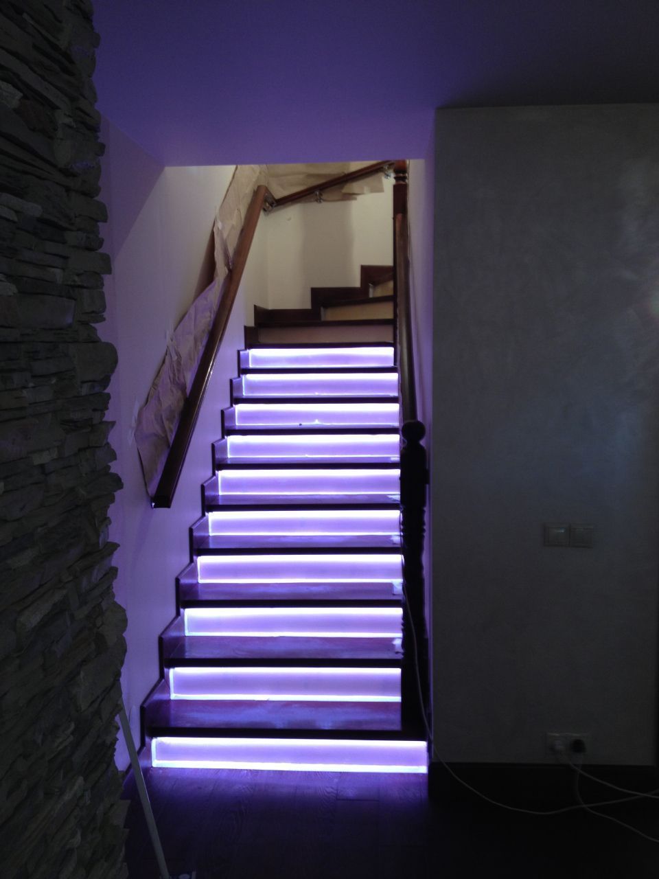 Многоцветная светодиодная подсветка лестницы в частном доме в коттеджем поселке "Белый Берег"