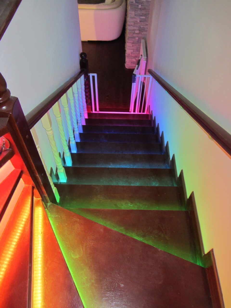 Включение подсветки запускается при подходе к лестнице от инфракрасных датчиков движения внизу и вверху неё. Изюминкой данной лестницы стал световой эффект постепенного освещения ступеней. Ступени загораются снизу вверх при подъеме по лестнице и сверху вниз при спуске с неё. При этом ступени загораются не просто одна за другой, а постепенно, слева направо (относительно направления движения). Светодиодная подсветка работает в двух режимах - белом и многоцветном (цвета радуги).