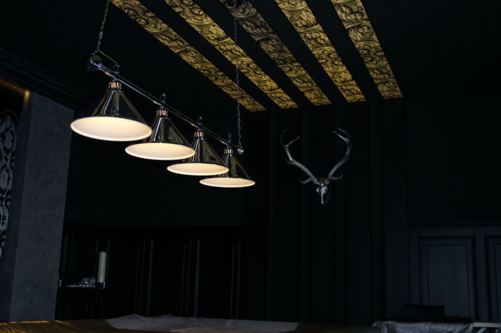 Равномерная подсветка колонн, закарнизная подсветка, подсветка штор гармонично сочетаются с интерьером всего клуба.