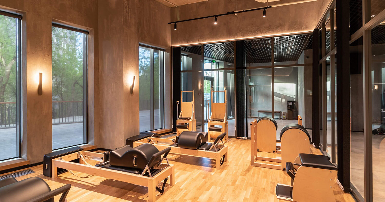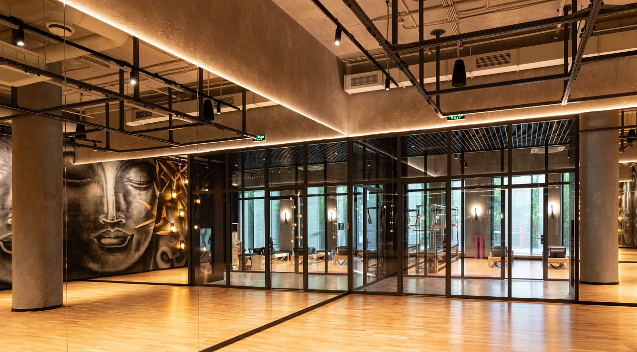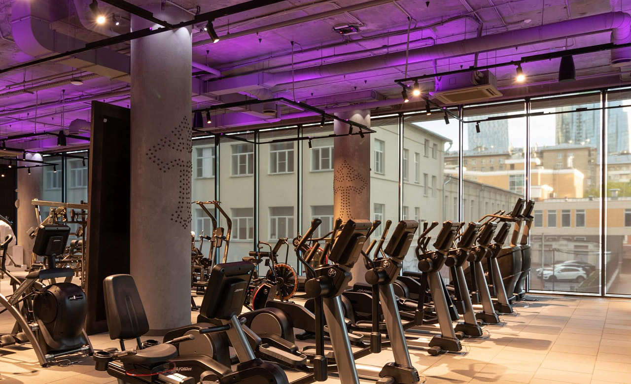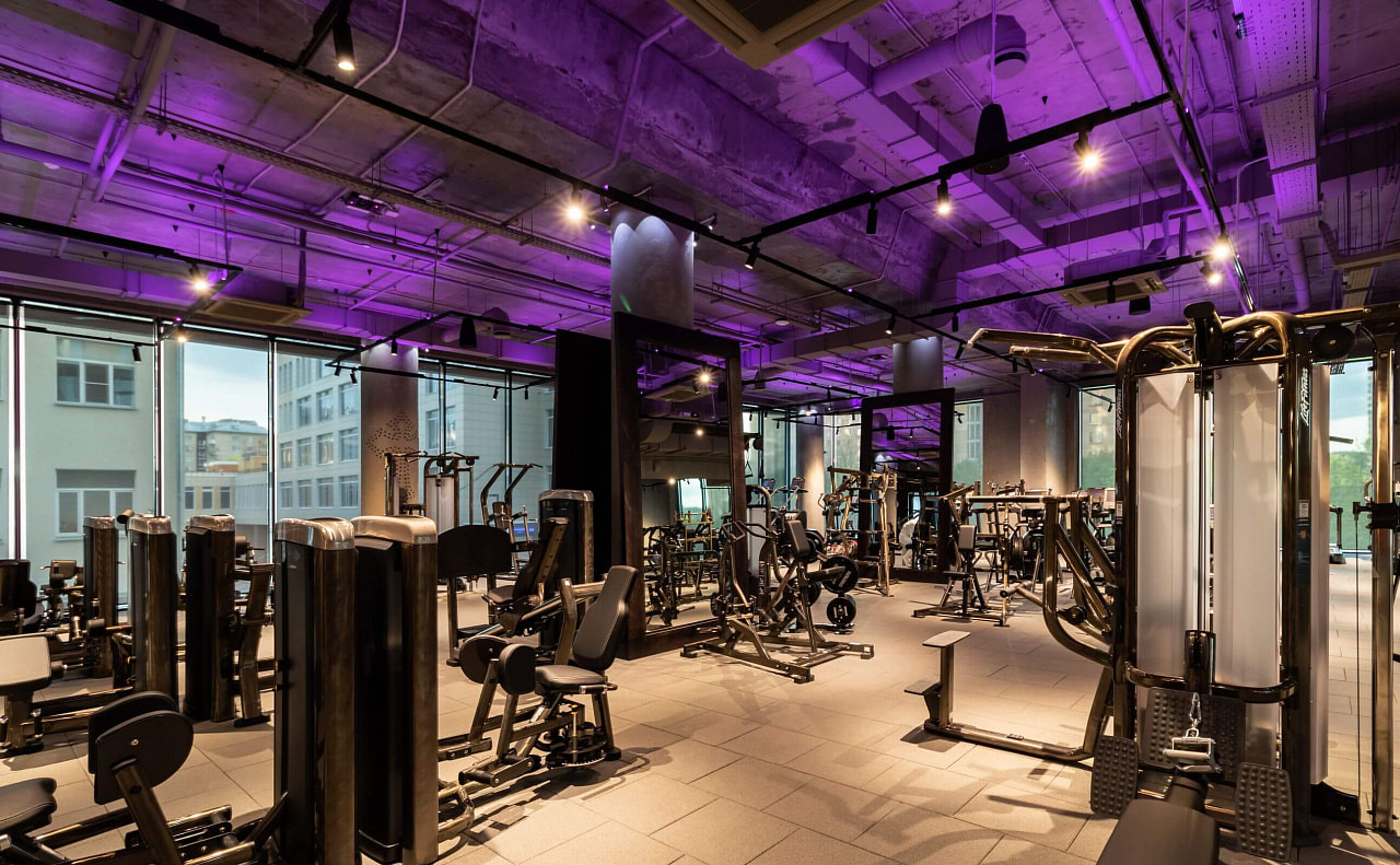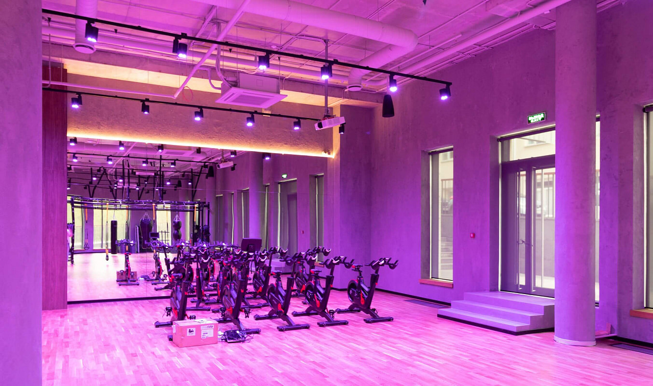 В тренажерном зале с большой площадью использованы магнитные трековые системы, которые разместились по всему периметру потолка. Светильники с высоким индексом цветопередачи и поворотным корпусом не только обеспечивают комфортный уровень освещения, но и позволяют быстро менять световые акценты. Еще один плюс данной системы освещения — возможность диммирования. В зависимости от времени суток яркость светильников можно менять в автоматическом режиме.