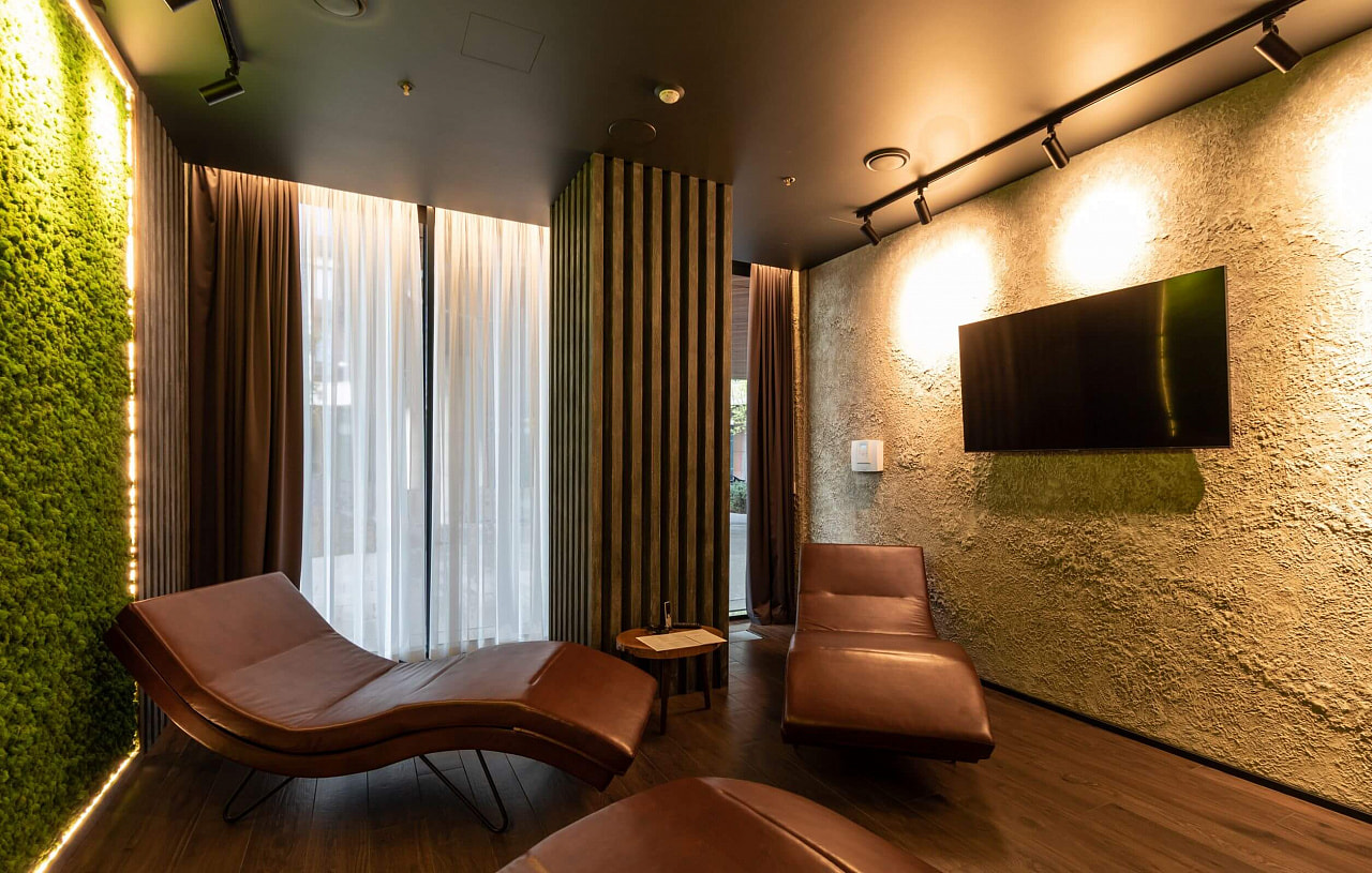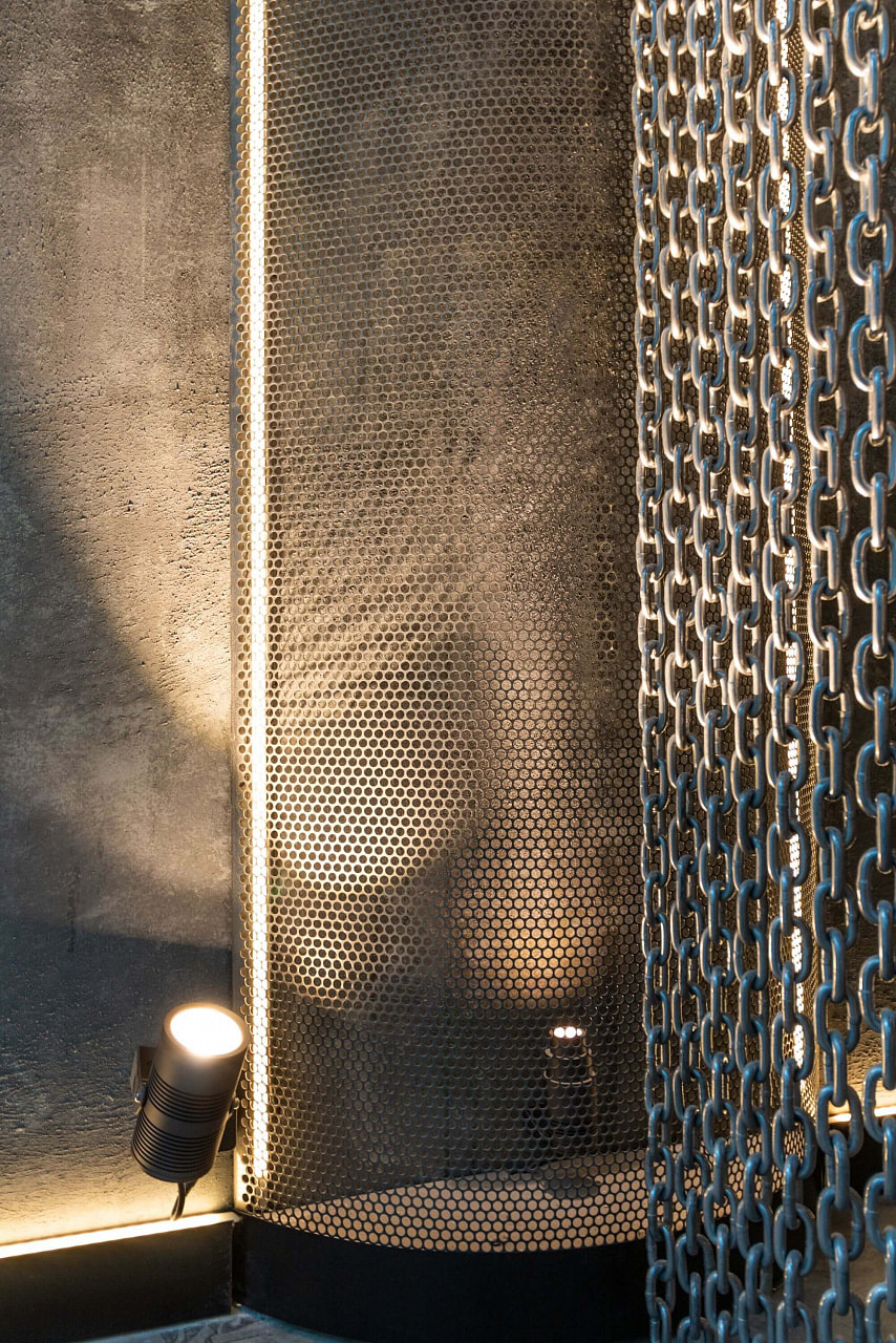 В зоне отдыха используются линейные светильники из алюминиевого профиля и влагозащищенной светодиодной ленты. Брутальный, индустриальный дизайн фитнес-клуба с обилием бетона, металла и стекла подчеркнут идеальным светом.