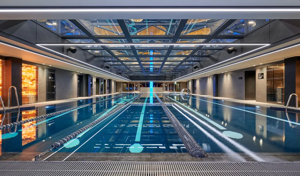 Визитная карточка фитнес-центра — 25-метровый бассейн, который расположен на нижнем этаже двусветного пространства, разделенного стеклянной крышей с перекрытиями.