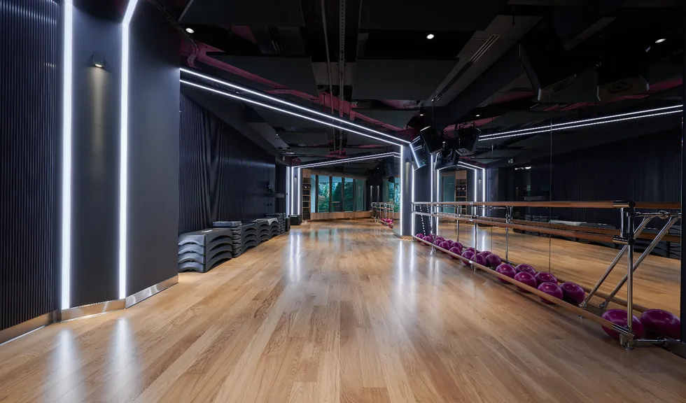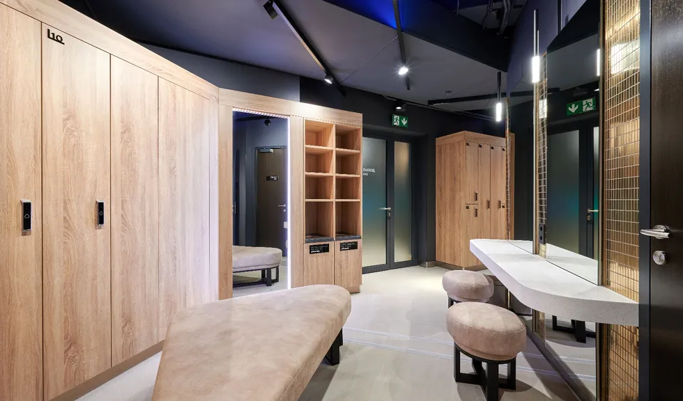 Просторные и стильные тренажерные залы оборудованы новейшей техникой для эффективных и безопасных тренировок. Особую атмосферу в зале создает тщательно продуманное освещение. Оно не только не мешает во время тренировок, но и привносит в пространство футуристические мотивы. Подсветка из линий света холодного белого и синего цветов задает мотивирующий настрой, в то время как золотистая инсталляция на потолке в свете гибкого неона теплого свечения является олицетворением премиальности. Стильные и уютные раздевалки также оборудованы RGB-подсветкой, которая эффектно направлена на открытые потолочные коммуникации. Зеркала подсвечиваются вертикальными линиями света дневного белого свечения, которое лучше всего передает естественные оттенки кожи.