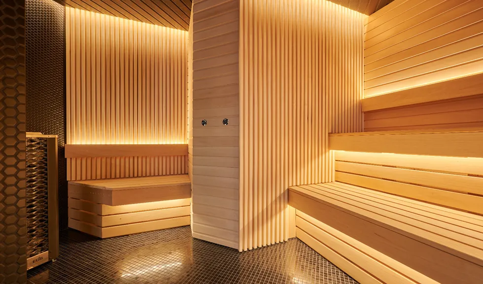 Еще одно особое пространство в фитнес-центре — термальные SPA-зоны. Для освещения финской сауны была использована герметичная светодиодная лента со степенью пылевлагозащиты IP68 и широким диапазоном рабочих температур. Умеренная яркость ленты органично рифмуется с деревянной отделкой, создавая расслабляющую и уютную атмосферу. Интерьер традиционного хаммама выполнен в аутентичном восточном стиле в светлых тонах. Подсветка белого цвета свечения подчеркивает легкую цветовую гамму и создает ощущение чистоты.
