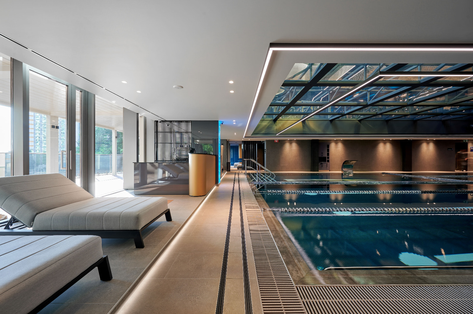К бассейну примыкают детская и лаундж-зоны. Расположенные рядом с панорамными окнами, пространства заполнены естественным светом.