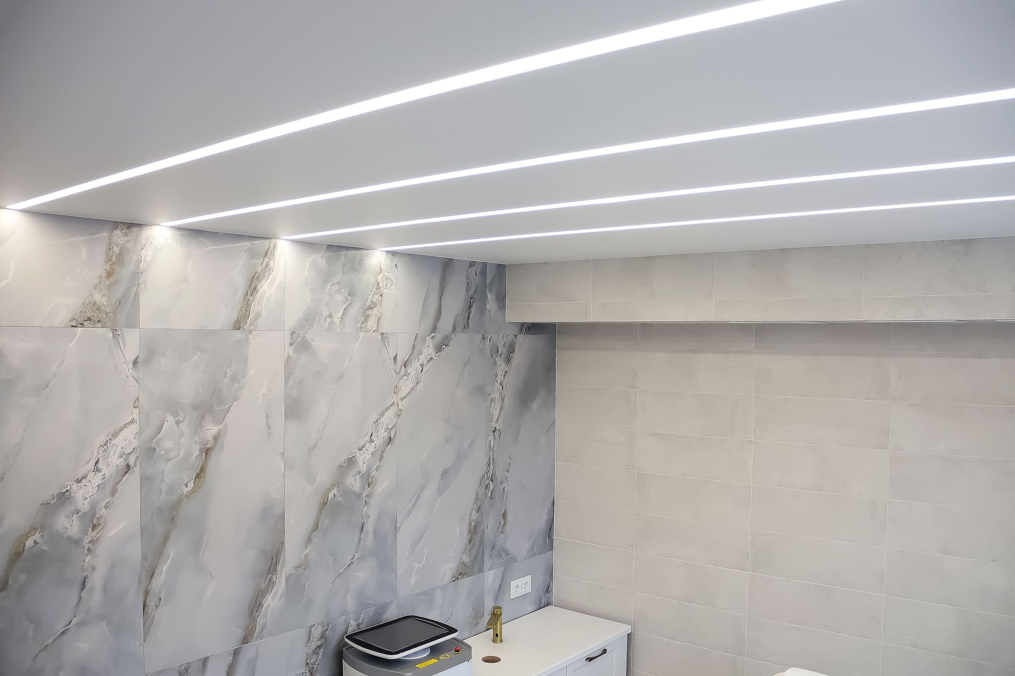 Свет в интерьере клиники соответствует общей концепции дизайна. В отделке использованы холодные оттенки белого и серого, которые подчеркиваются нейтральным дневным светом (4000 К).
