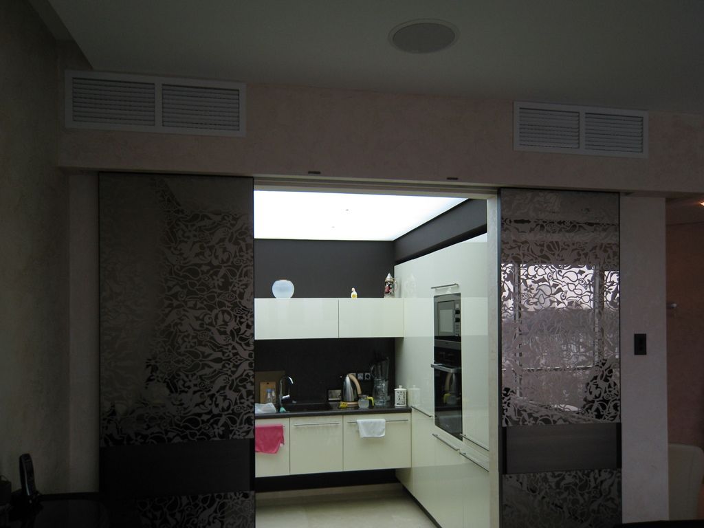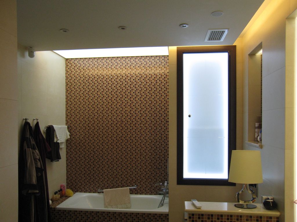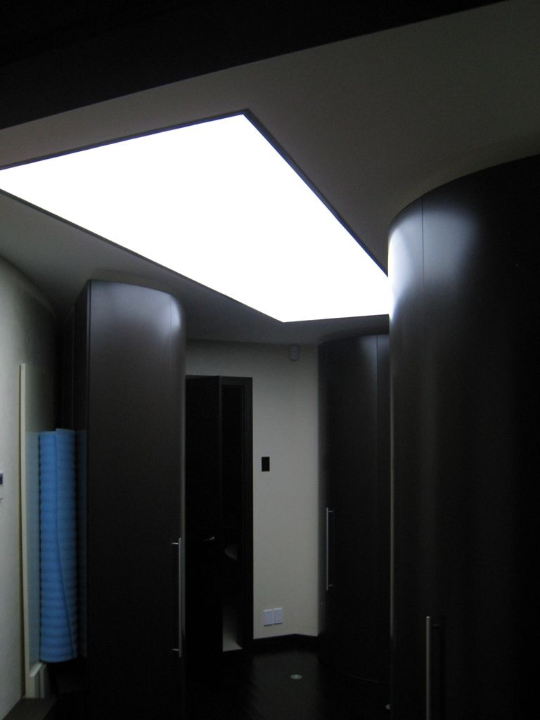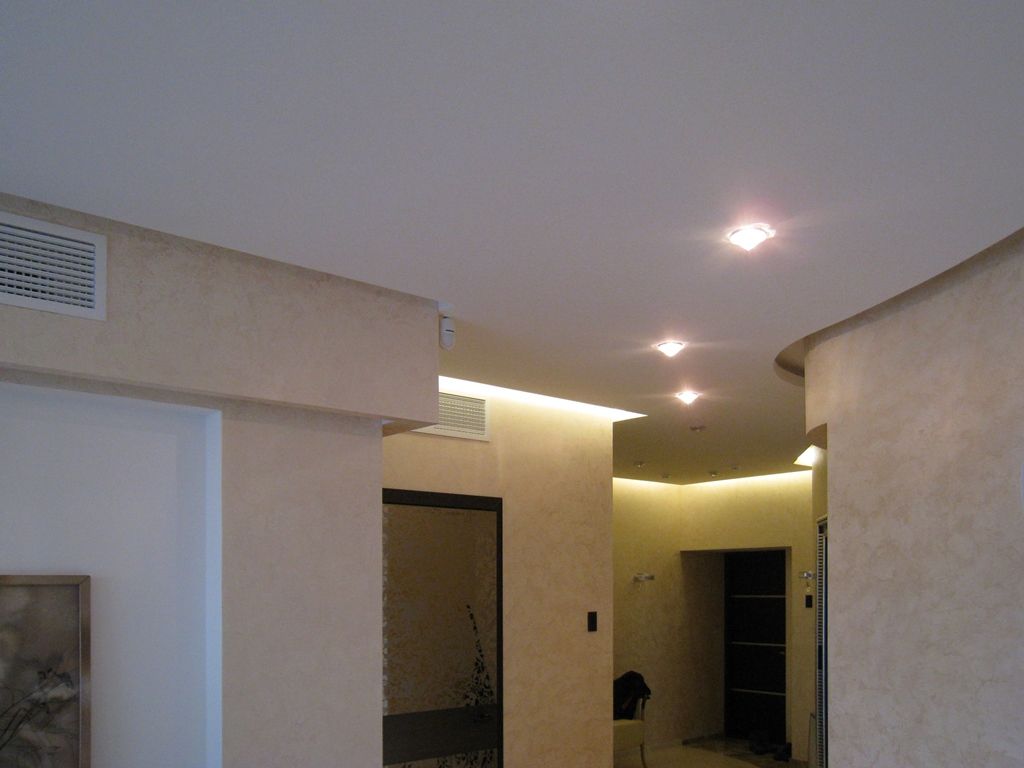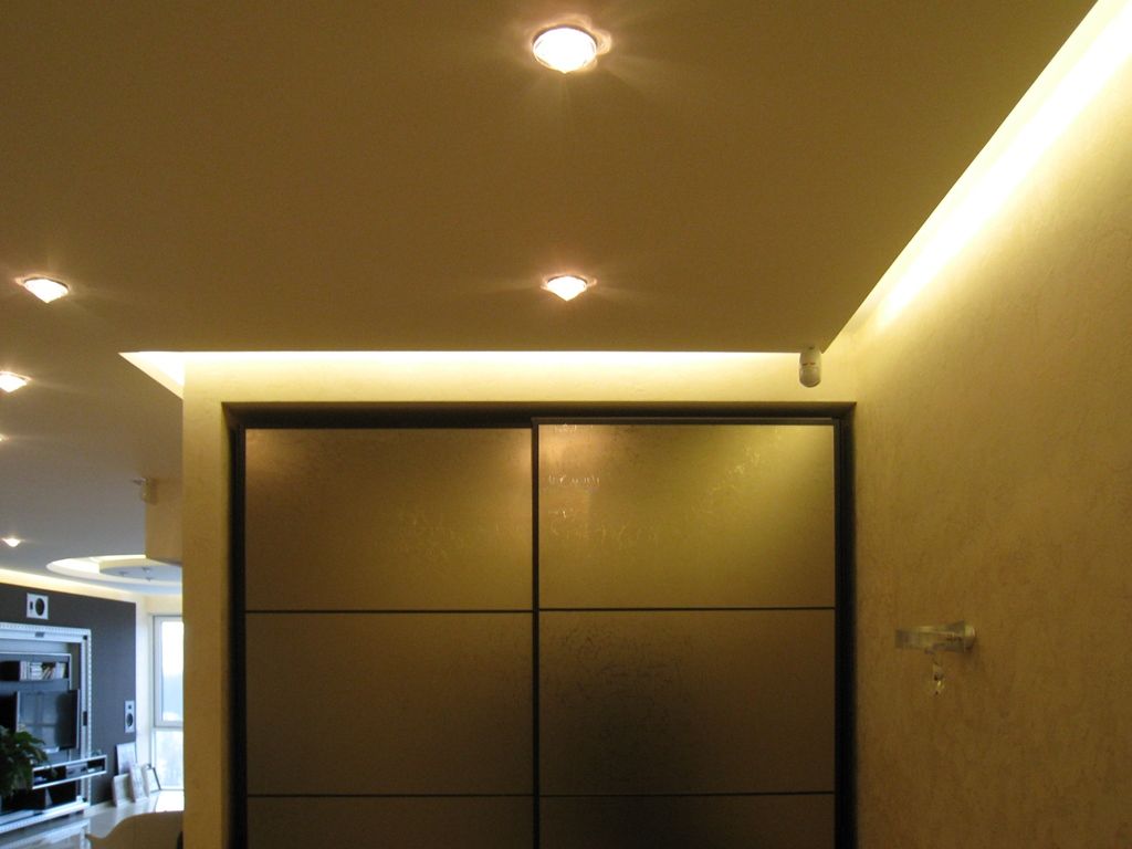 В данном проекте было реализовано необычное решение основного освещения в квартире. В различных помещениях нет привычного центрального источника света. Освещение осуществляется рассеянным светом, который реализуется при помощи закарнизной светодиодной подсветки, светодиодных светильников
