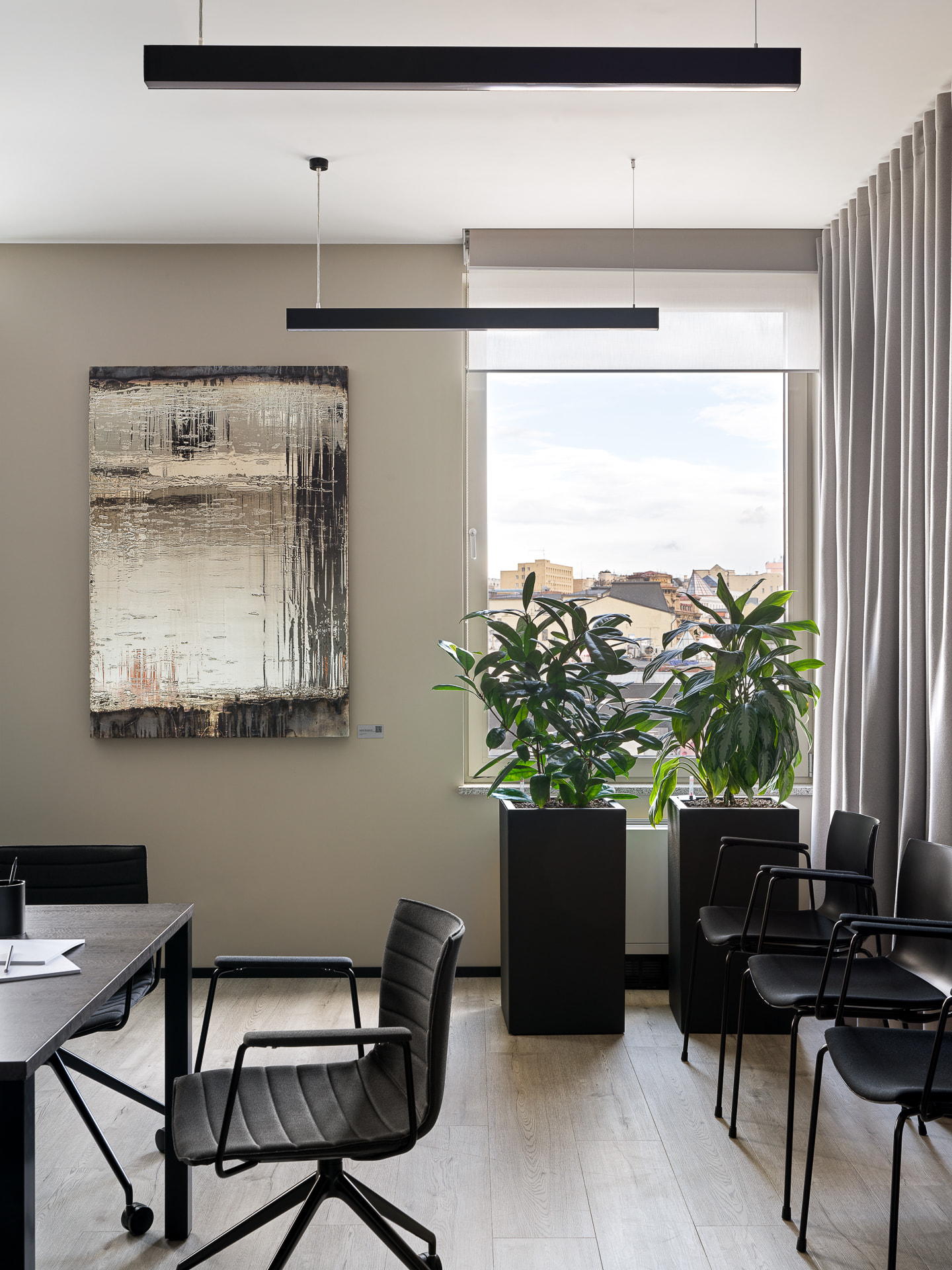 Линейные светильники LINE для кабинетов и переговорных комнат создали общий приятный свет и графичный рисунок на потолке.
