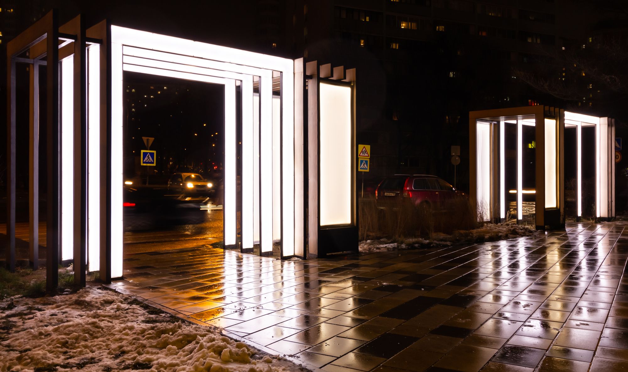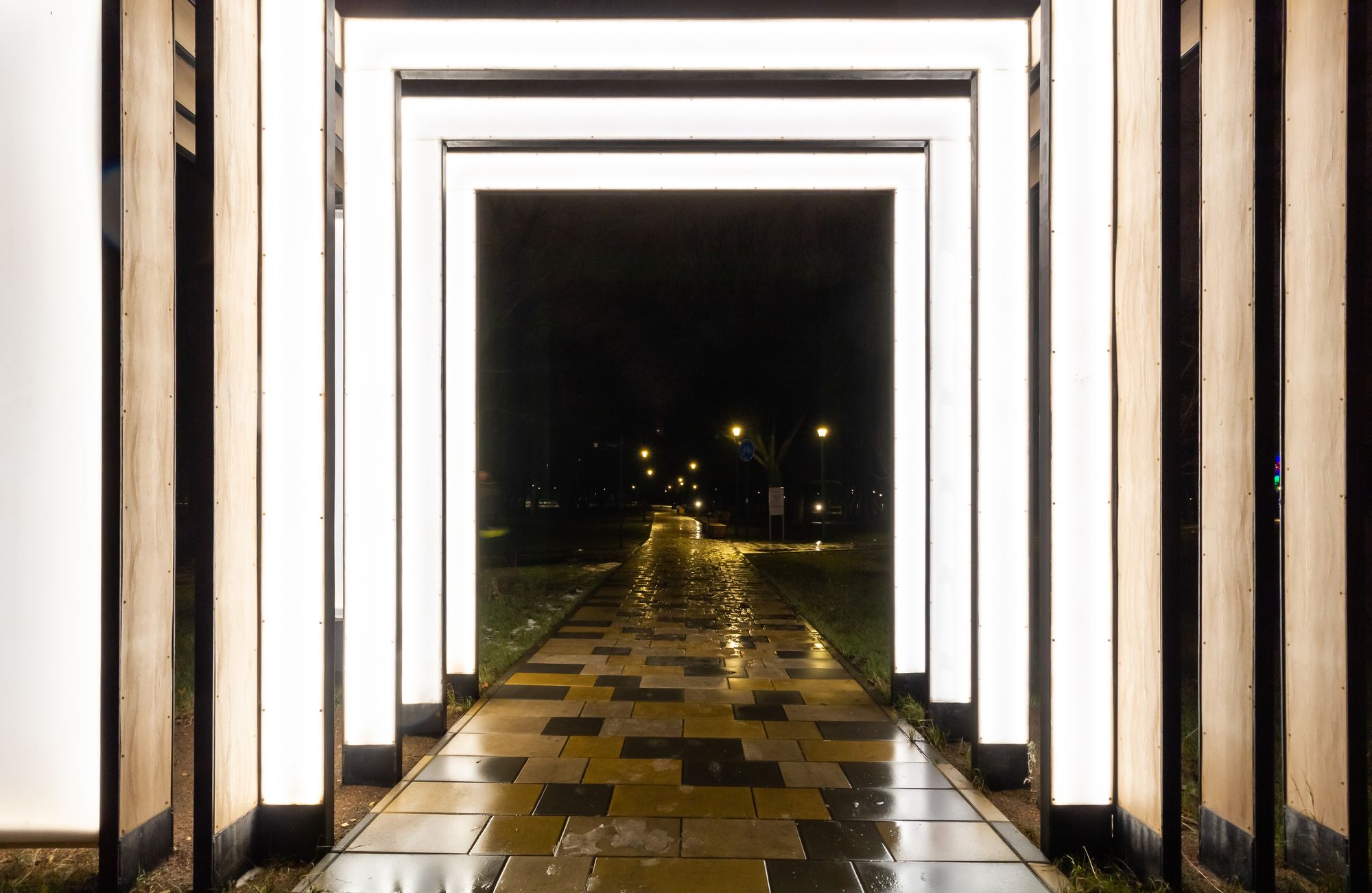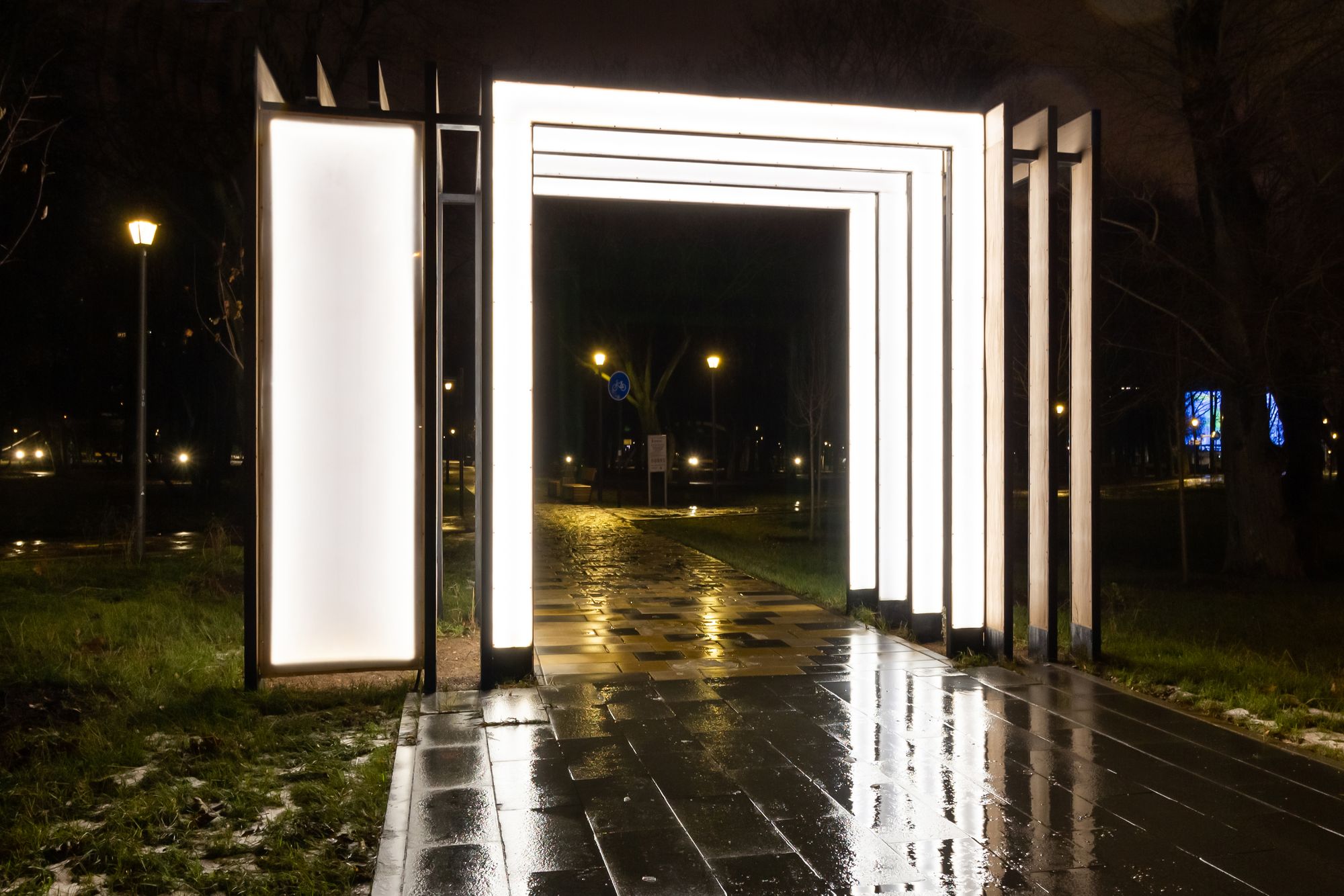 Главной световой композицией является арка при входе в парк, созданная при помощи широких световых полос мягкого дневного свечения. В проекте использованы герметичные светодиодные ленты с высокой степенью пылевлагозащиты (IP65).