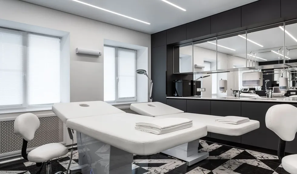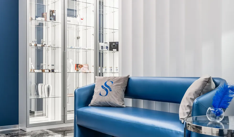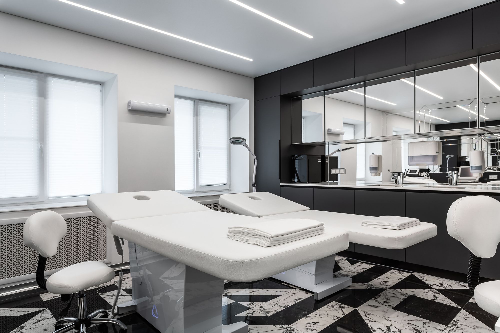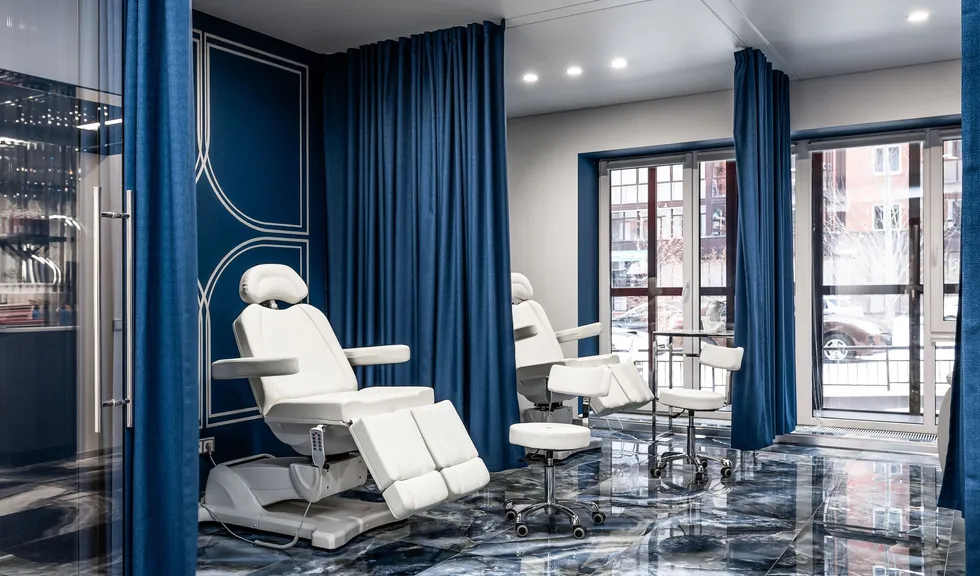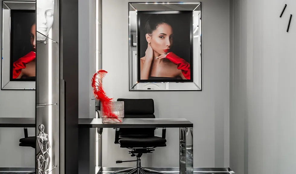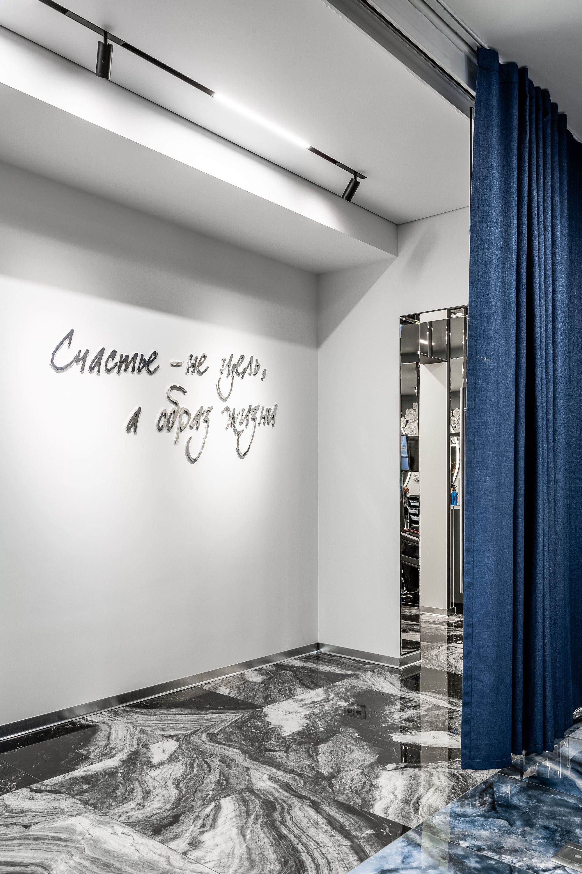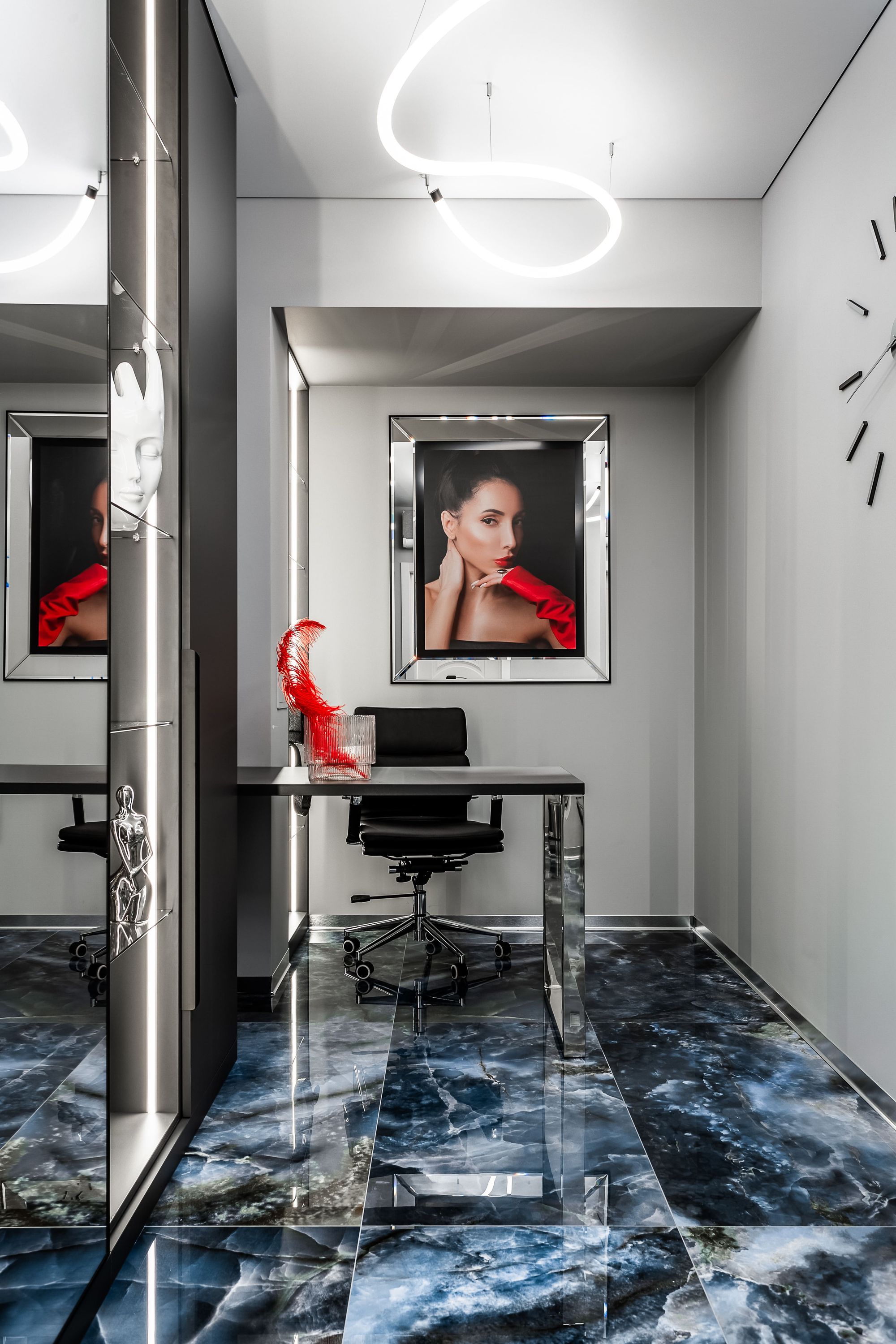 Интерьер салона красоты — в стиле контрастного и дерзкого футуризма с элементами ар-деко — заставит любую женщину почувствовать себя королевой. Роскошные панели и керамогранит, множество зеркал, водопады переливающегося стекла, оригинальная фотозона для клиенток — все эти элементы интерьера сливаются в единое синергическое пространство в том числе благодаря свету.