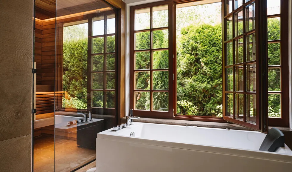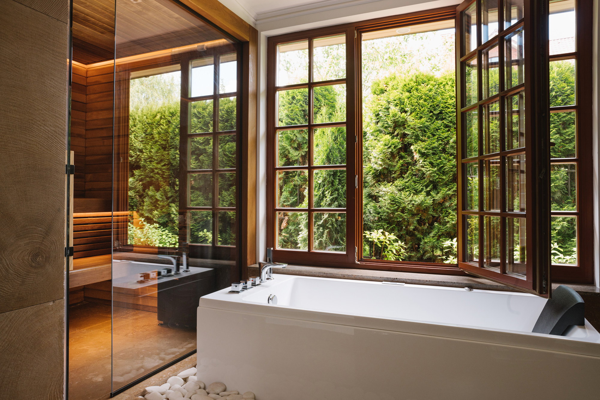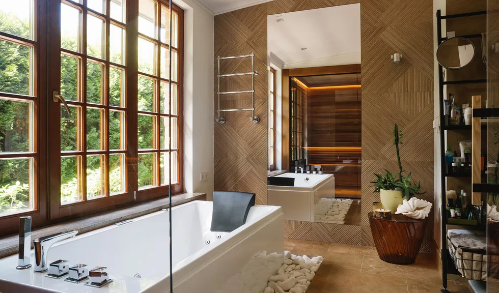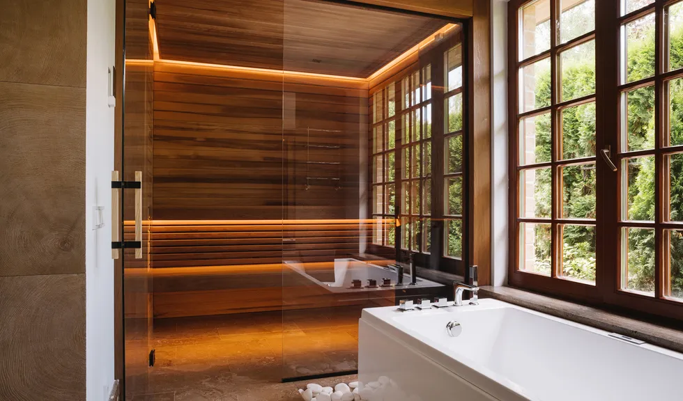 Уютная сауна отделена от ванной комнаты прозрачной стеклянной перегородкой, что визуально делает компактное пространство шире. Полки и отделка стен внутри парной выполнены из термоосины, которая отталкивает влагу и обладает низкой теплопроводностью.
