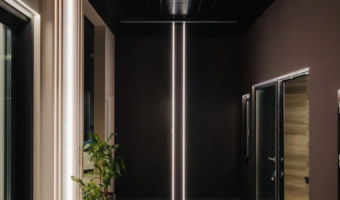 Различные линии света гармонично вписаны в пространство. Подвесные линейные светильники на потолке создают основное освещение, а также становятся частью декоративных потолочных композиций. Вертикальные световые линии, простирающиеся от пола до потолка, подчеркивают декоративную рельефность стен и привносят в пространство изящную легкость.