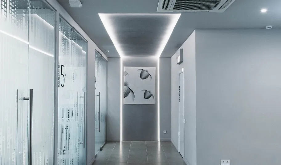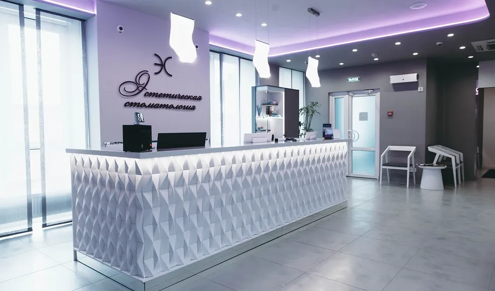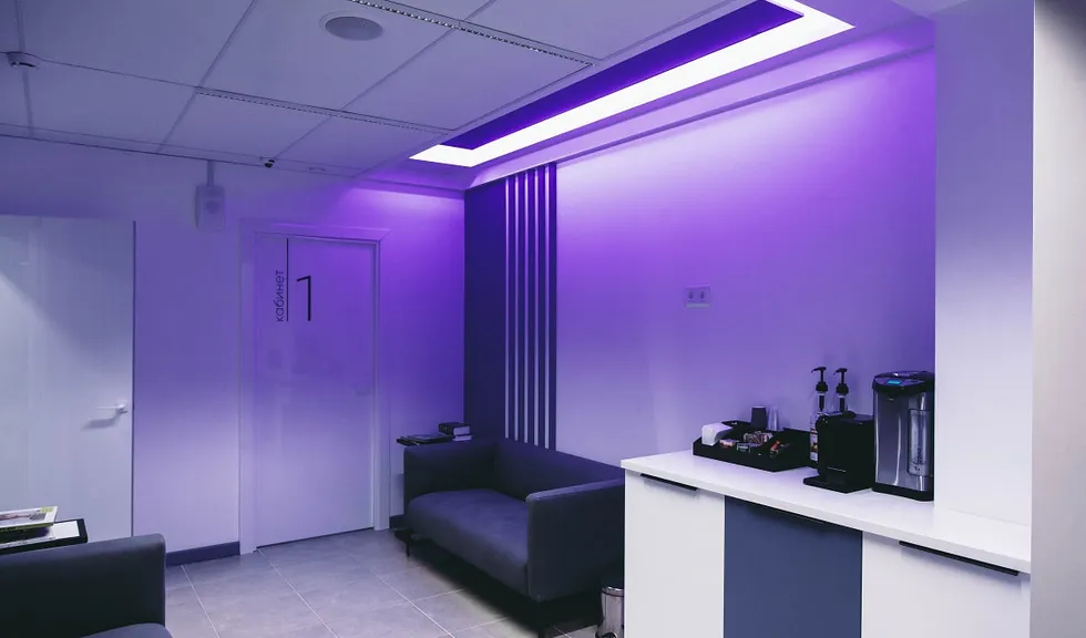 Фирменный цвет клиники «Эстетическая стоматология» — фиолетовый: он ассоциируется у клиентов с роскошью и элитарностью, что подсознательно внушает доверие. Нежно-фиолетовая подсветка на потолке в зоне ресепшен, созданная на основе RGBW-ленты серии LUX, становится частью оформления бренда.