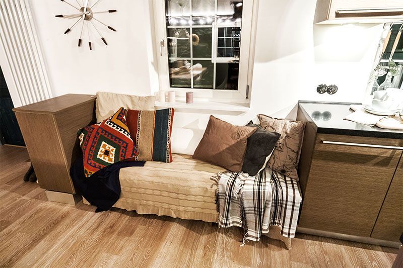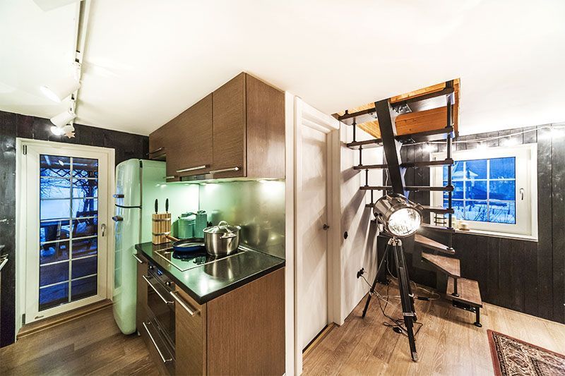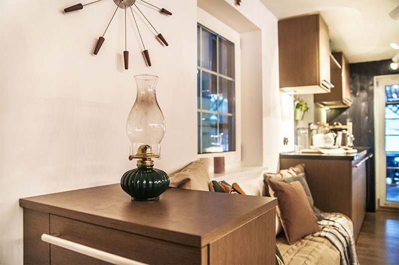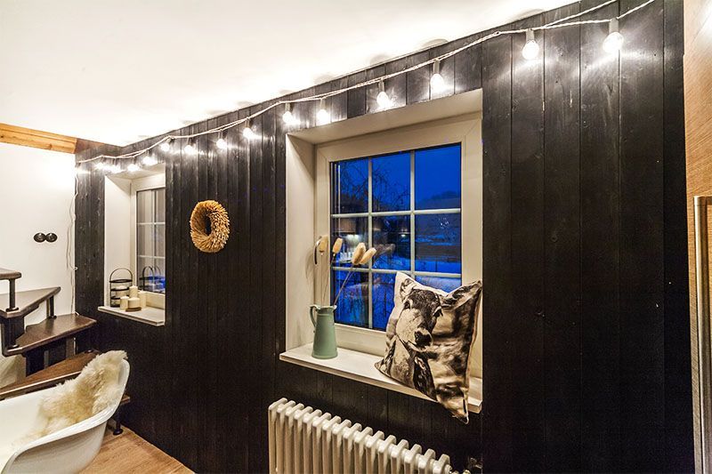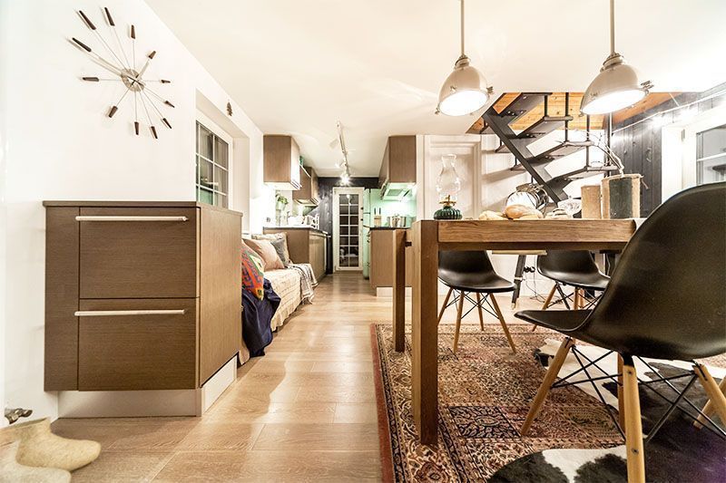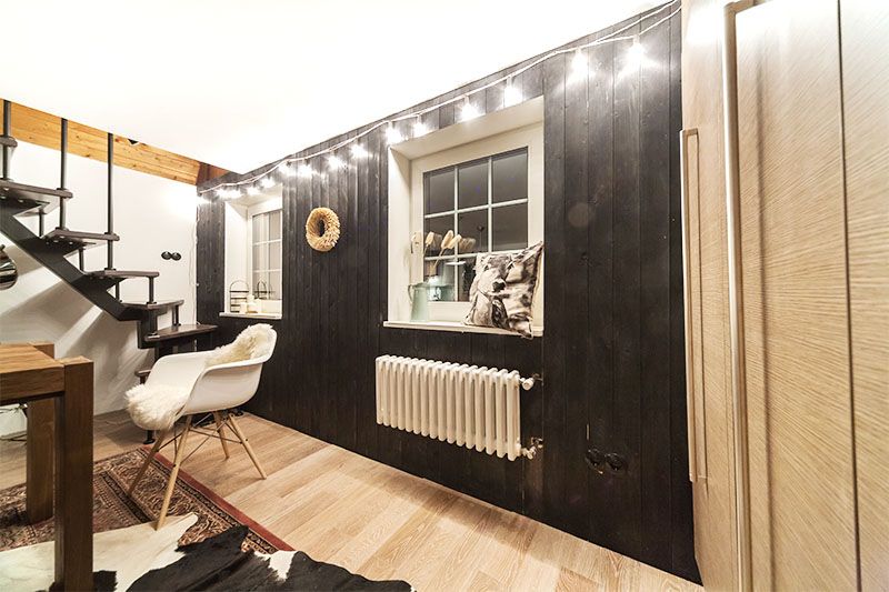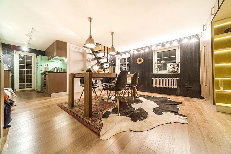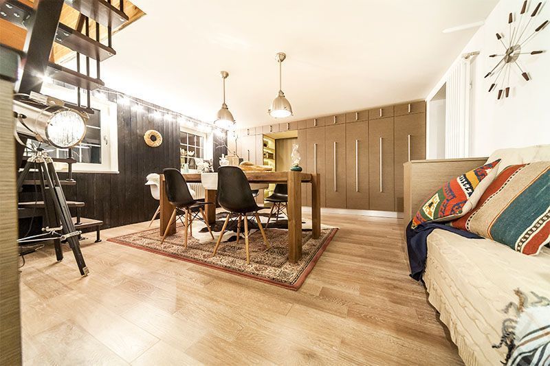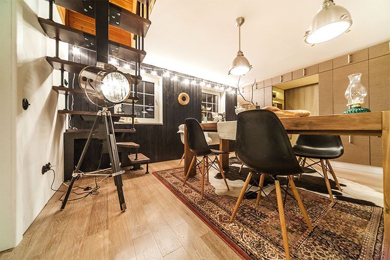 Освещение комнаты играет на нюансах. Гирлянда под старину напоминает о долгой истории дома, современные потолочные светильники подчеркивают новизну переделки, а кинематографический прожектор – будущее старшего сына наших героев, студента ВГИКа.