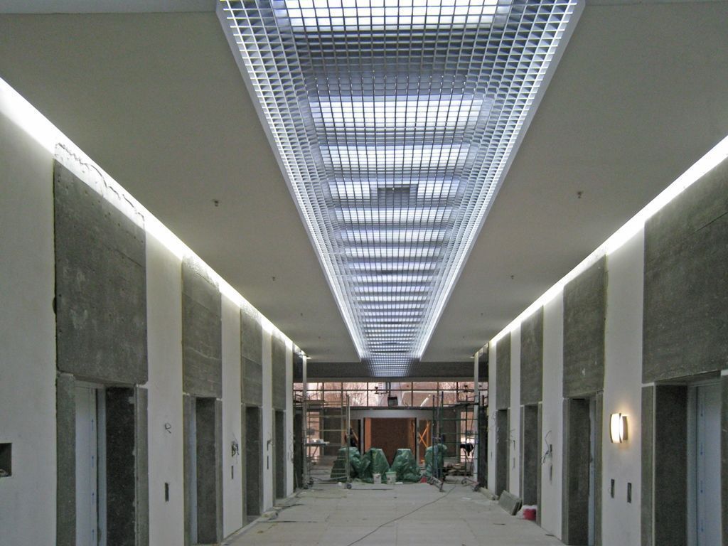 Освещение коридора в торговой палате было дополнено светодиодным освещением, расположенным за навесным гипсокартонным многоуровневым потолком. Также была сделана многоцветная подсветка декоративных панелей с применением светодиодной ленты