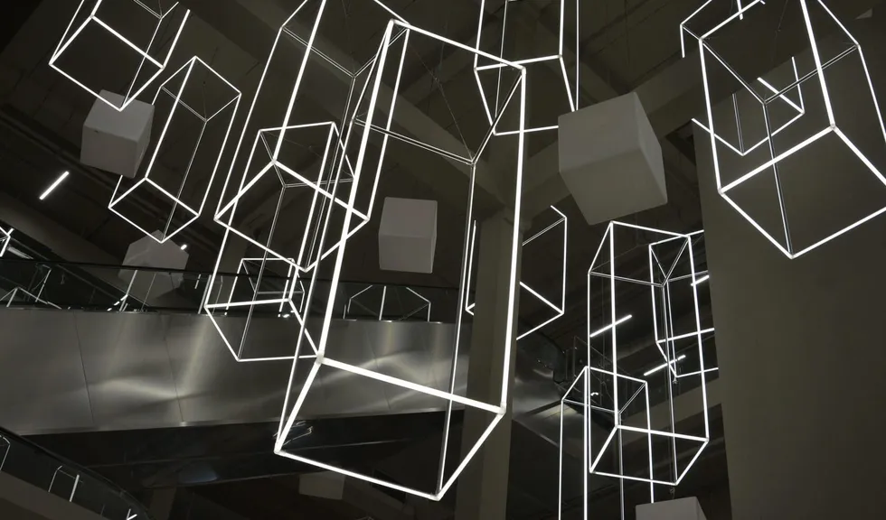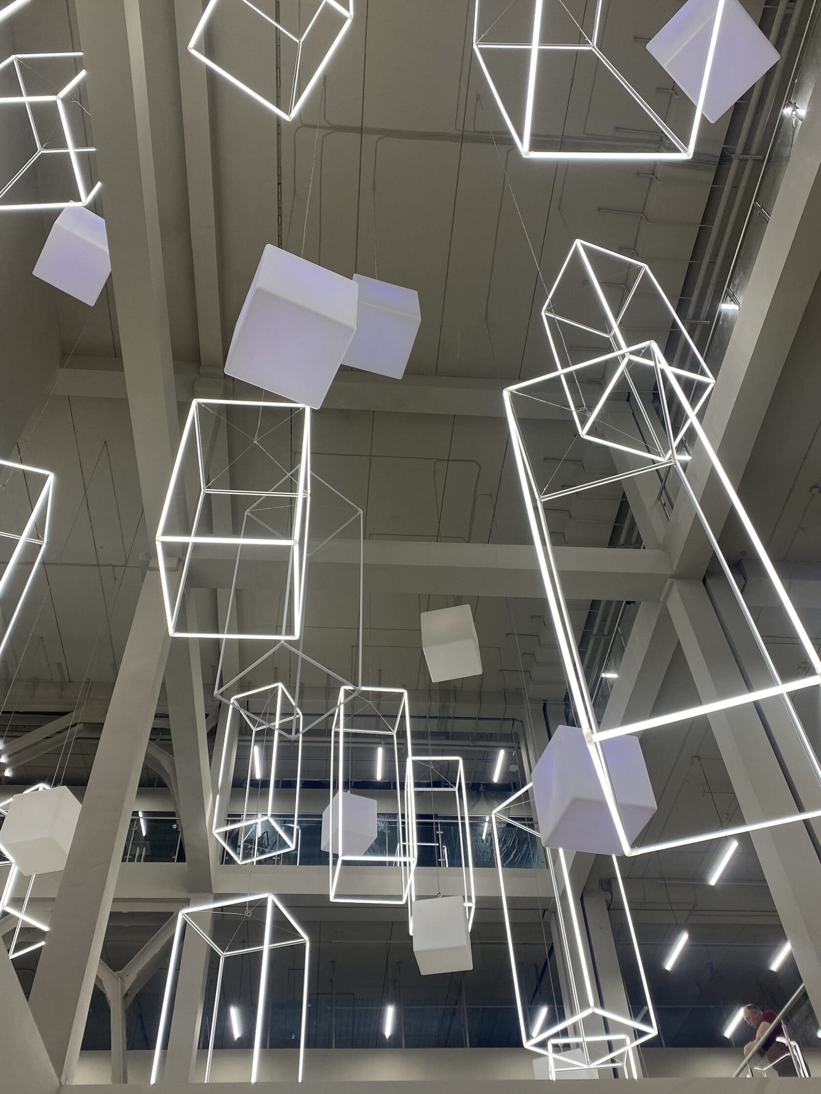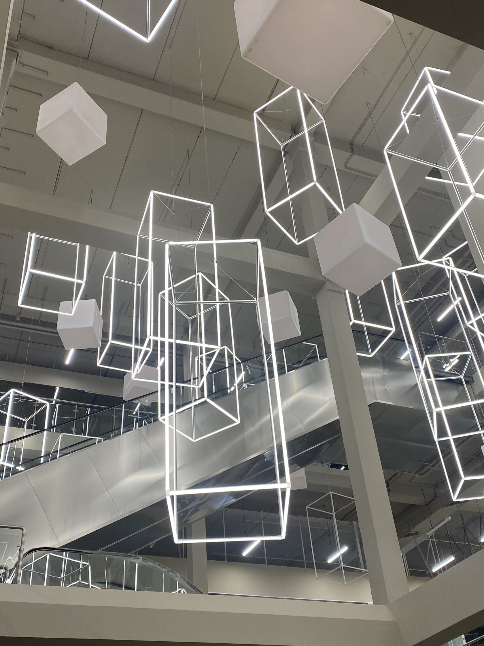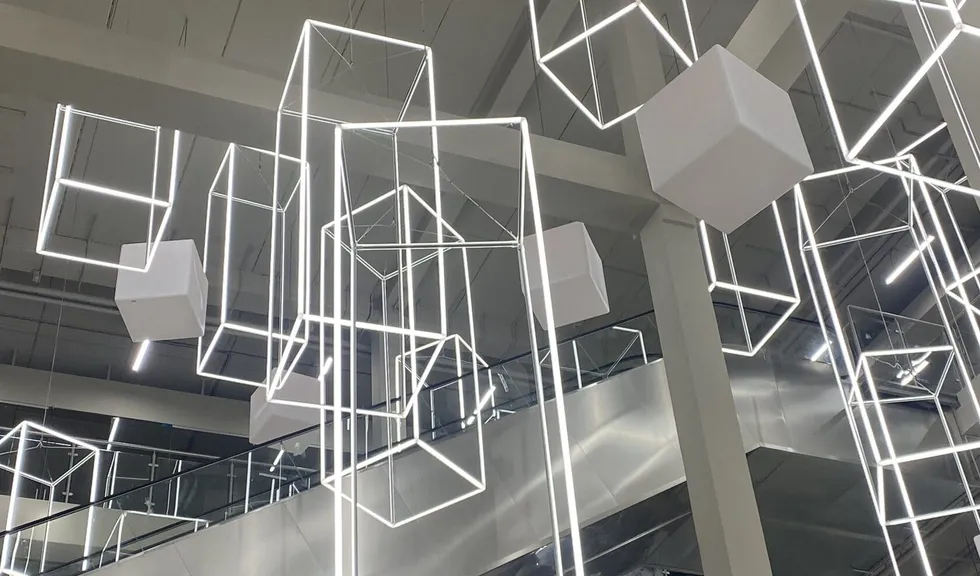 С этой целью для атриума торгового центра «Парк» были созданы светодиодные инсталляции в форме параллелепипедов. Подвесные конструкции со светящимися гранями смотрятся оригинально и воздушно: они заполняют пространство атриума, перекликаясь с другими кубическими элементами дизайна.