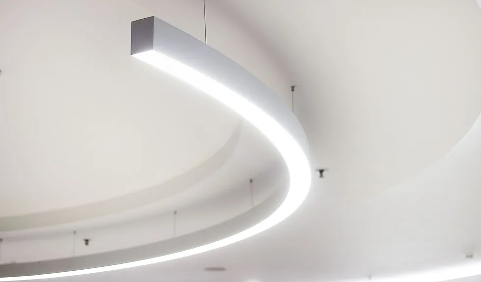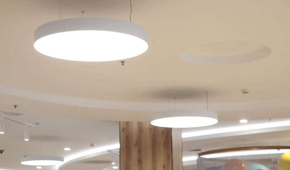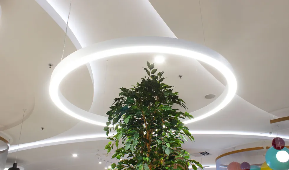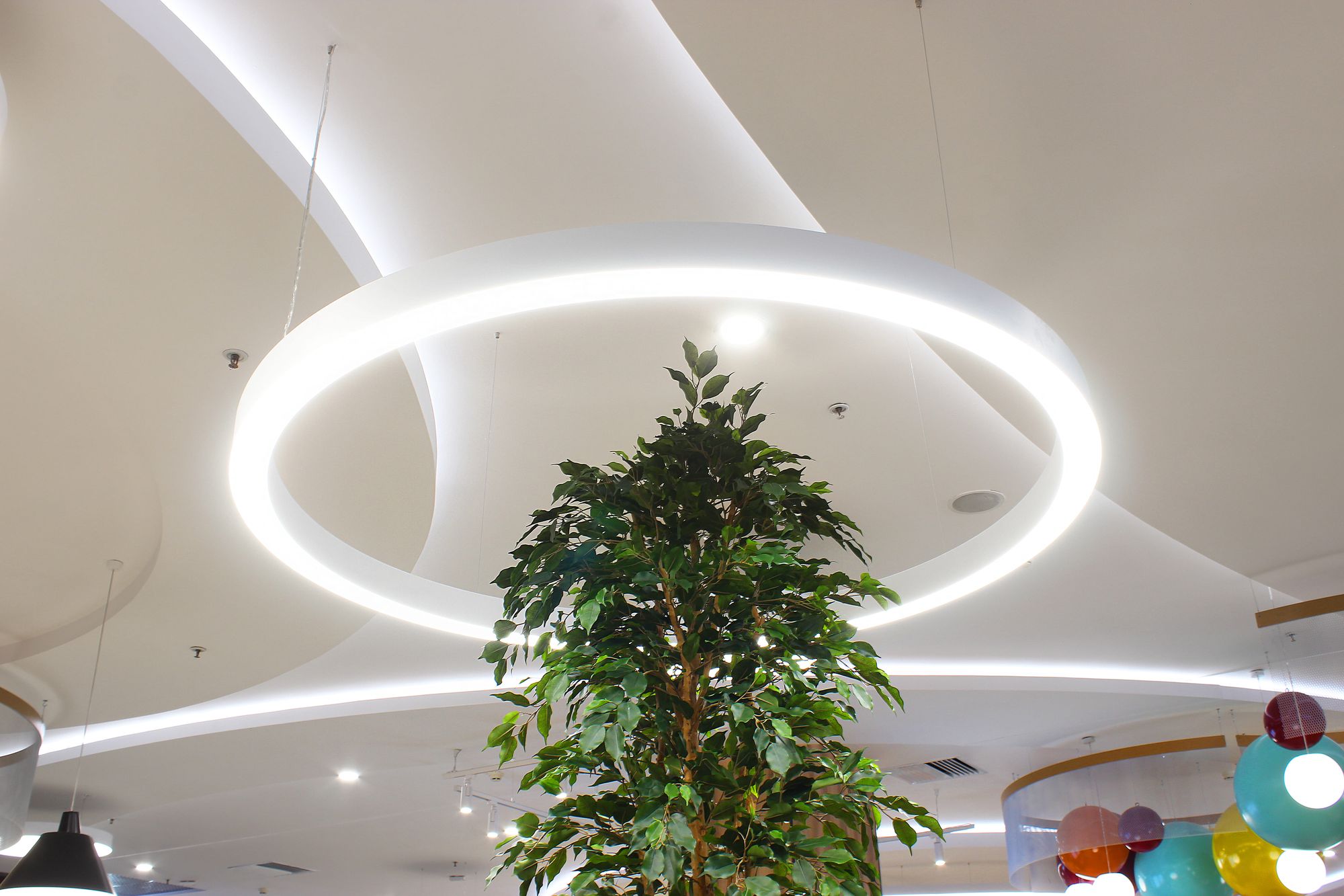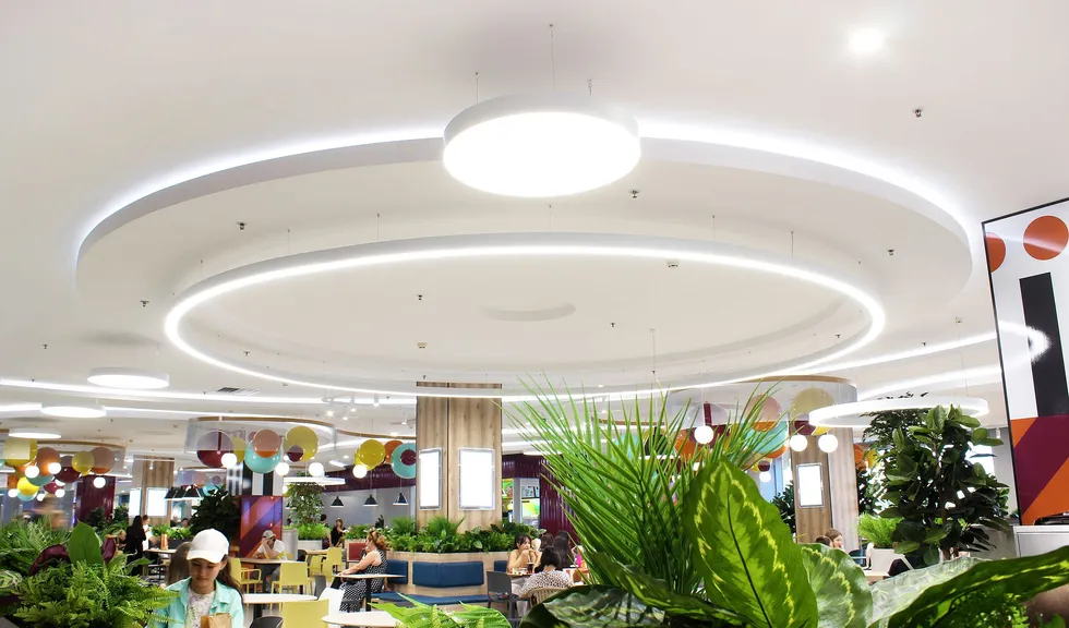 Светильники поддерживают общую тему: в интерьере используются светильники-шары и круглые даунлайты, дуговые профильные светильники, а изгибы округлых ниш и выступов подчеркивает бодрящая белая подсветка на основе светодиодной ленты RT. Лента с превосходным индексом цветопередачи (CRI 95–98) не искажает цветовую гамму предметов и позволяет товарам выглядеть неизменно выигрышно.