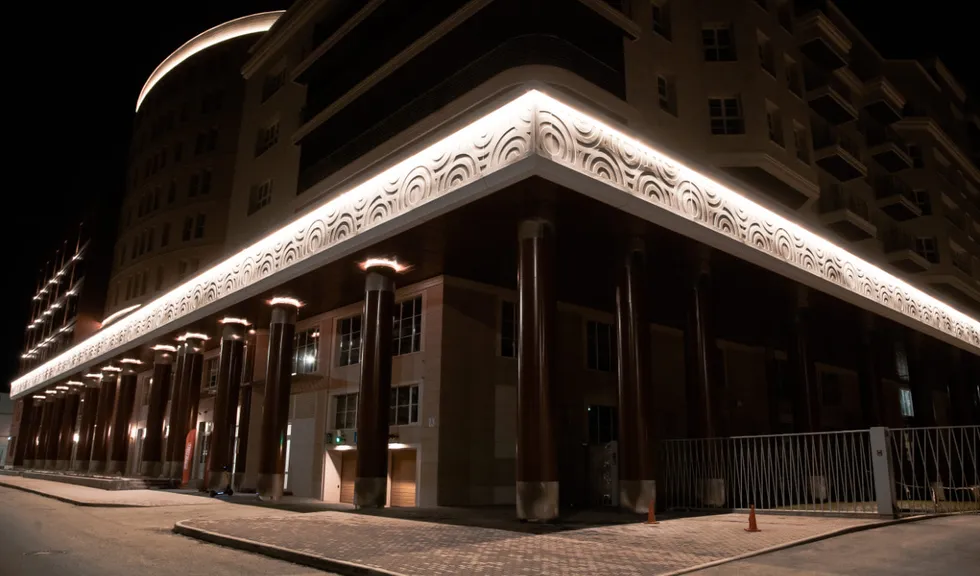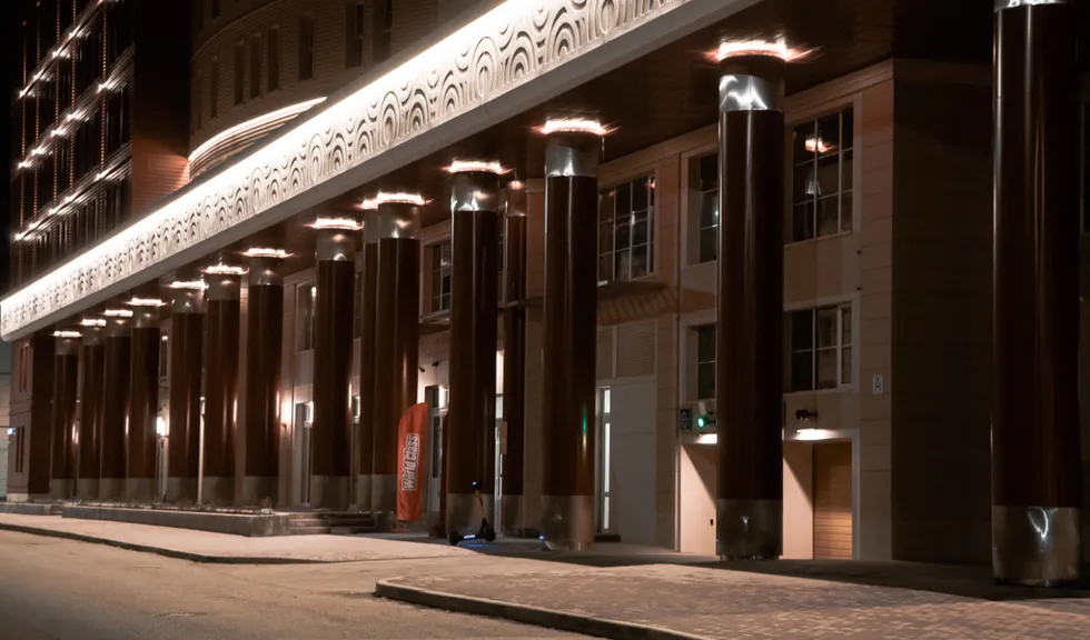 Подсветка фасадов выполнена на основе герметичной светодиодной ленты ARL PV C72 с цветовой температурой 3000 К. Теплый белый цвет свечения создает уютный и умиротворяющий облик здания и хорошо подходит для акцента классических декоративных элементов. Округлый орнамент на фризе оживает в свете подсветки, а рифленая поверхность фасада приобретает объем. Широкая подсветка верхнего и нижнего контура одного из корпусов плавно очерчивает строение в темное время суток.